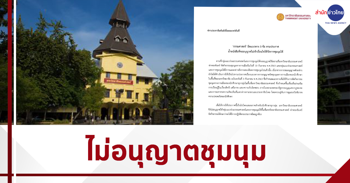 มธ. 10 ก.ย. – ม.ธรรมศาสตร์ ไม่อนุญาตให้จัดการชุมนุมในวันที่ 19 ก.ย. เนื่องจากหนังสือที่ขออนุญาตของกลุ่มแนวร่วมธรรมศาสตร์และการชุมนุม ไม่เข้าเงื่อนไข
