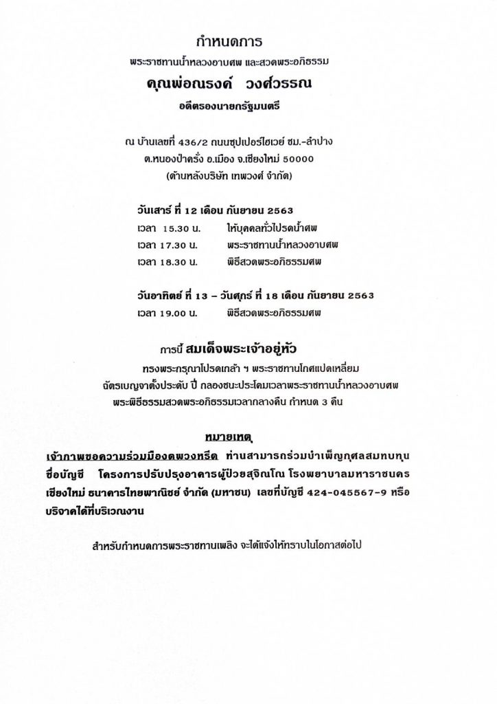 โดยจะมีพิธีรดน้ำศพที่บ้านพักของ “ณรงค์ วงศ์วรรณ” บ้านเลขที่ 436/2 ถนนซุปเปอร์ไฮเวย์ เชียงใหม่-ลำปาง ต.หนองป่าครั่ง อ.เมือง จ.เชียงใหม่ ในวันที่ 12 ก.ย. เวลา 15.30 น. และพระราชทานน้ำหลวงอาบศพ เวลา 17.30 น. สวดพระอภิธรรมศพถึงวันที่ 18 ก.ย.63
