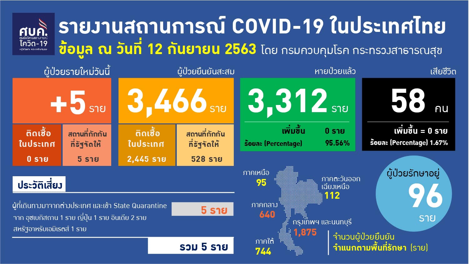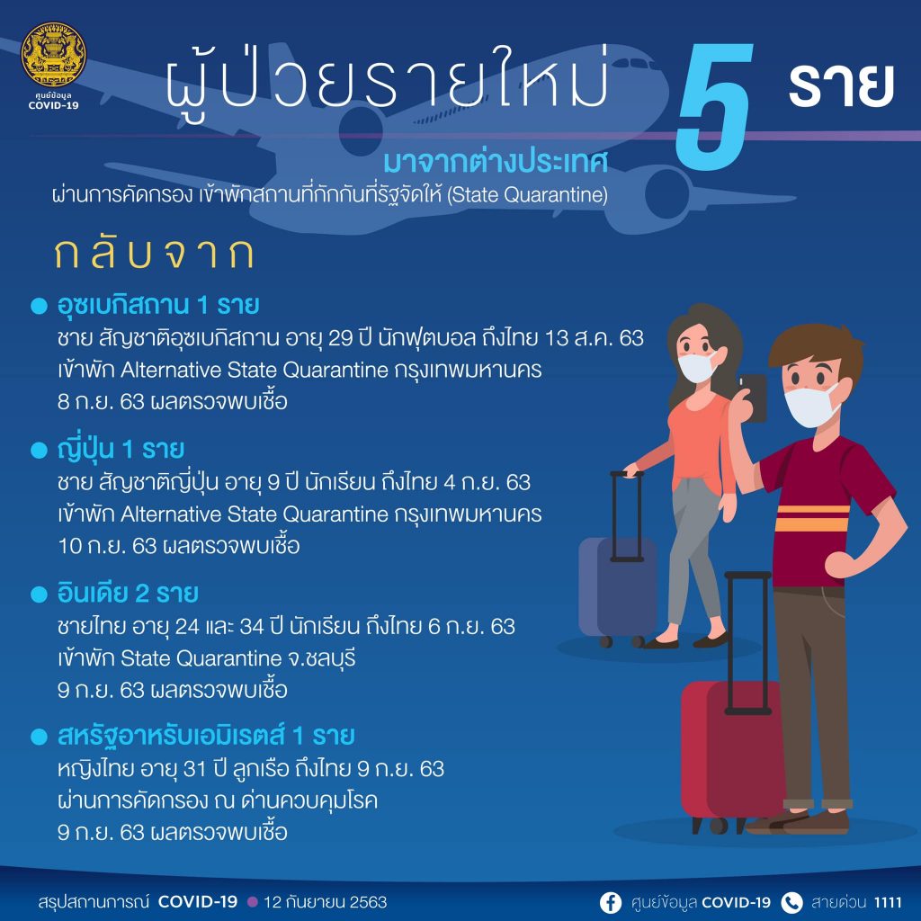 กทม. 12 ก.ย. – ศูนย์บริหารสถานการณ์โควิด-19 รายงานสถานการณ์ COVID-19 ในประเทศไทย วันที่ 12 ก.ย.63 พบผู้ติดเชื้อรายใหม่5 ราย มาจากต่างประเทศ เป็นนักฟุตบอลชาวอุซเบกิสถาน 1 ราย ญี่ปุ่น 1 ราย อินเดีย 2 ราย สหรัฐอาหรับเอมิเรตส์ 1 ราย อยู่ใน State Quarantine