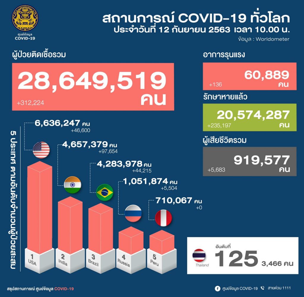 ส่วนสถานการณ์ทั่วโลก มียอดผู้ติดเชื้อรวม 28,649,519 คน อาการรุนแรง 60,889 คน รักษาหายแล้ว 20,574,287 คน เสียชีวิต 919,577 คน . – สำนักข่าวไทย