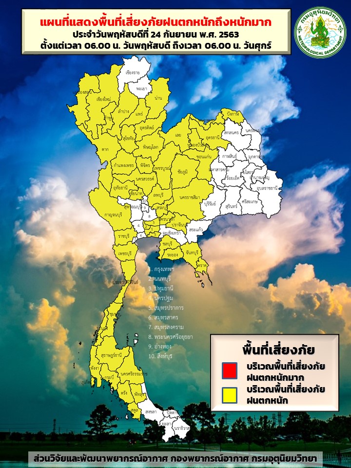กรมอุตุนิยมวิทยา พยากรณ์อากาศ 24 ชั่วโมงข้างหน้า บริเวณประเทศไทยมีฝนเพิ่มขึ้น และมีฝนตกหนักบางแห่งบริเวณภาคเหนือ ภาคตะวันออกเฉียงเหนือ ภาคกลาง ภาคตะวันออก และภาคใต้ ทั้งนี้เนื่องจากร่องมรสุมพาดผ่านภาคเหนือตอนล่าง ภาคกลางตอนบน และภาคตะวันออกเฉียงเหนือตอนล่างเข้าสู่หย่อมความกดอากาศต่ำบริเวณทะเลจีนใต้ตอนกลาง ประกอบกับมรสุมตะวันตกเฉียงใต้ยังคงพัดปกคลุมทะเลอันดามัน และภาคใต้ ขอให้ประชาชนที่อาศัยอยู่บริเวณพื้นที่เสี่ยงภัยในภาคเหนือ ภาคตะวันออกเฉียงเหนือ และภาคใต้ระวังอันตรายจากฝนตกหนักและฝนที่ตกสะสมไว้ด้วย
