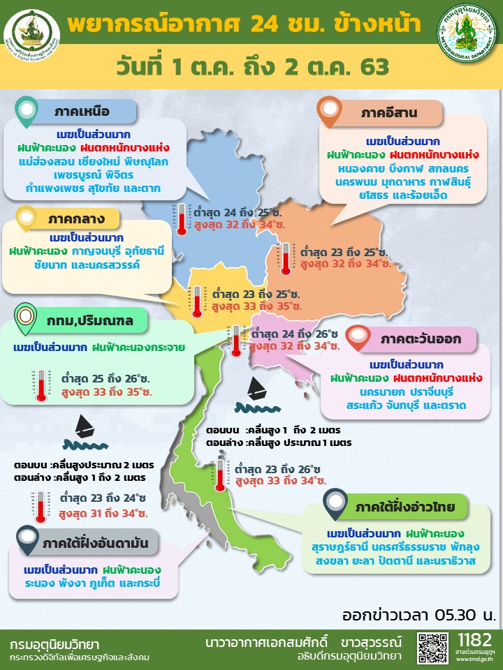 กรมอุตุนิยมวิทยา พยากรณ์อากาศ 24 ชั่วโมงข้างหน้า ร่องมรสุมพาดผ่านภาคเหนือตอนล่าง ภาคกลางตอนบน และภาคตะวันออกเฉียงเหนือ เข้าสู่หย่อมความกดอากาศต่ำบริเวณทะเลจีนใต้ตอนกลาง ในขณะที่มรสุมตะวันตกเฉียงใต้ที่พัดปกคลุมทะเลอันดามัน ประเทศไทย และอ่าวไทยมีกำลังปานกลาง ทำให้ประเทศไทยยังคงมีฝนตกต่อเนื่อง และมีฝนตกหนักบางแห่งบริเวณภาคเหนือ ภาคตะวันออกเฉียงเหนือ และภาคตะวันออก ขอให้ประชาชนที่อาศัยในพื้นที่เสี่ยงภัยในภาคเหนือ และภาคตะวันออกเฉียงเหนือ ระวังอันตรายจากฝนที่ตกหนักและฝนที่ตกสะสมไว้ด้วย