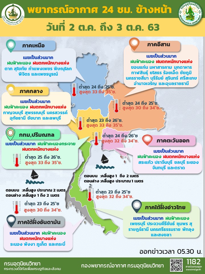 กรมอุตุนิยมวิทยา พยากรณ์อากาศ 24 ชั่วโมงข้างหน้า ร่องมรสุมพาดผ่านภาคเหนือตอนล่าง ภาคกลาง ภาคตะวันออก และภาคตะวันออกเฉียงเหนือตอนล่าง เข้าสู่หย่อมความกดอากาศต่ำบริเวณชายฝั่งประเทศเวียดนามตอนกลาง ในขณะที่มรสุมตะวันตกเฉียงใต้ที่พัดปกคลุมทะเลอันดามัน ประเทศไทย และอ่าวไทยมีกำลังปานกลาง ทำให้ประเทศไทยยังคงมีฝนตกต่อเนื่อง และมีฝนตกหนักบางแห่งบริเวณภาคเหนือ ภาคตะวันออกเฉียงเหนือ ภาคกลาง กรุงเทพมหานครและปริมณฑล รวมทั้งภาคตะวันออก ขอให้ประชาชนที่อาศัยในพื้นที่เสี่ยงภัยบริเวณดังกล่าว ระวังอันตรายจากฝนที่ตกหนักและฝนที่ตกสะสมไว้ด้วย