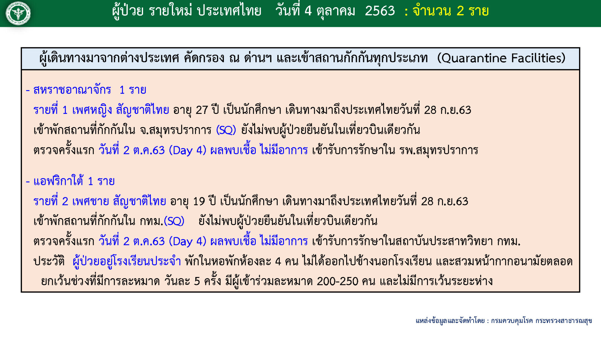 สำนักข่าวไทย 4 ต.ค.- ศบค.รายงานสถานการณ์การติดเชื้อ COVID-19 ในไทย วันอาทิตย์ 4 ตุลาคม 2563 พบผู้ติดเชื้อรายใหม่ 2 ราย เดินทางจากต่างประเทศ และเข้าพักใน State Quarantine