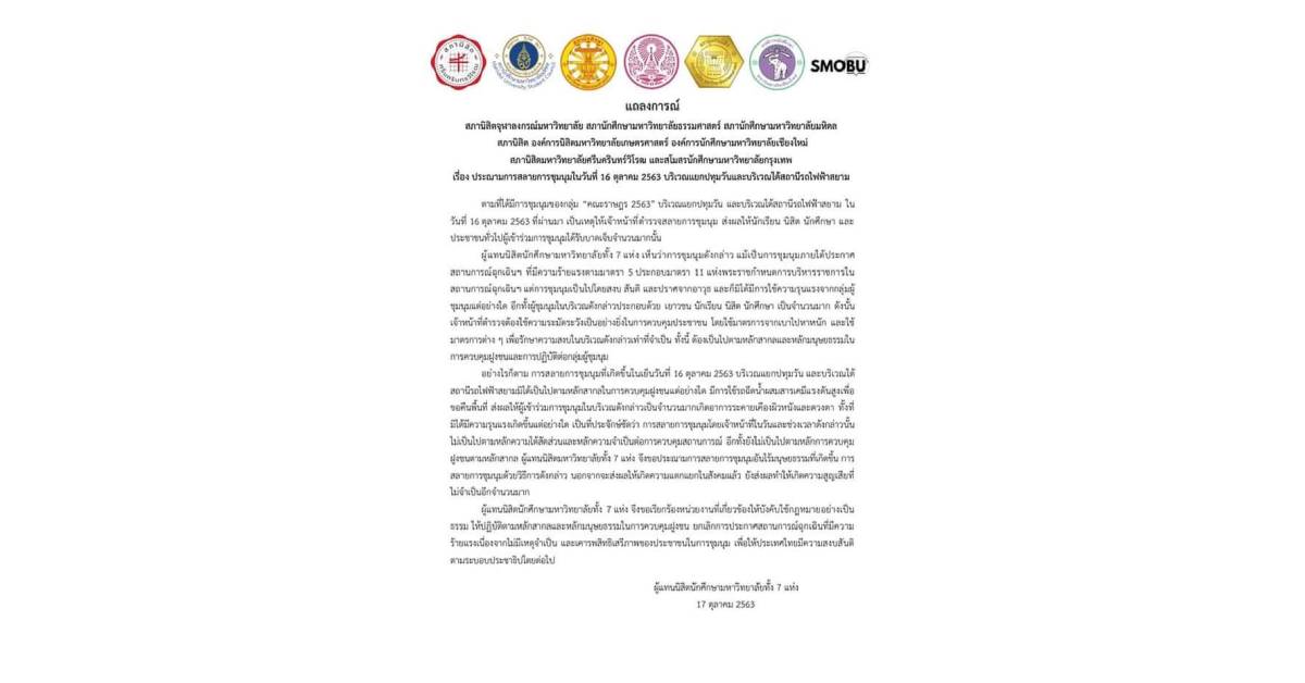 แถลงการณ์จาก 8 ตัวแทนองค์การนิสิตนักศึกษาจากมหาวิทยาลัย ได้แก่ องค์การบริหารสโมสรนิสิตจุฬาลงกรณ์มหาวิทยาลัย องค์การนักศึกษามหาวิทยาลัยธรรมศาสตร์ องค์การบริหาร องค์กรนิสิต มหาวิทยาลัยเกษตรศาสตร์ สโมสรนักศึกษามหาวิทยาลัยมหิดล สโมสรนักศึกษามหาวิทยาลัยศิลปากร องค์การนิสิตมหาวิทยาลัยศรีนครินทรวิโรฒ องค์การนักศึกษามหาวิทยาลัยเชียงใหม่ และองค์กรบริหารองค์การนักศึกษา มหาวิทยาลัยสงขลานครินทร์ ประณามการใช้ความรุนแรงในการสลายการชุมนุมวันที่ 16 ต.ค. ที่แยกปทุมวัน ซึ่งถือเป็นการกระทำที่สร้างความตื่นตระหนก ความหวาดกลัว และทำให้เกิดอันตรายแก่ประชาชนได้ เป็นการตอกย้ำว่ารัฐบาลและผู้มีอำนาจออกมารับผิดชอบในการเลือกวิธีที่ไร้ซึ่งมนุษยธรรม และไม่คำนึงถึงความปลอดภัยของประชาชนเป็นอันดับแรก พวกเราผู้แทนนิสิตนักศึกษาทั้ง 8 มหาวิทยาลัยขอประณามการใช้ความรุนแรงทุกรูปแบบในการเข้าสลายการชุมนุม