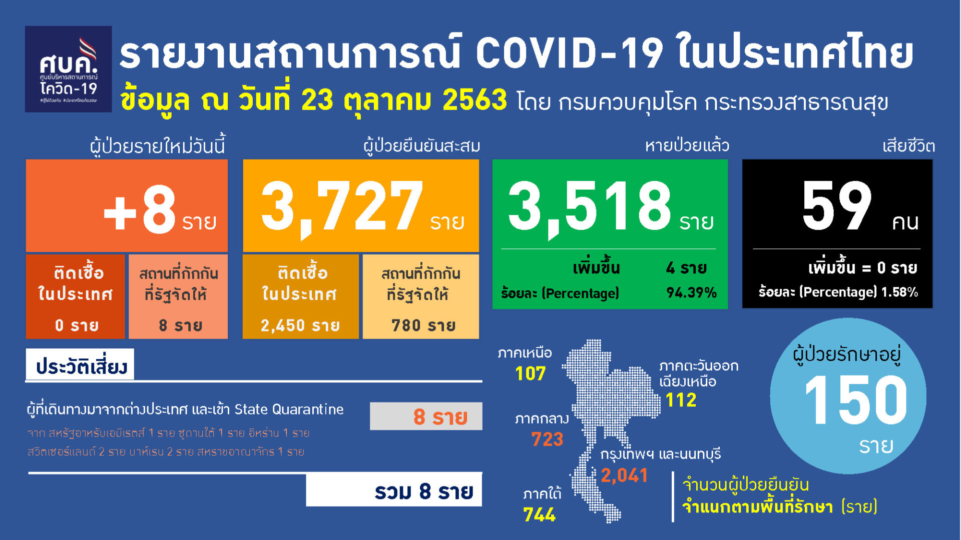 กทม. 23 ต.ค. – สถานการณ์ COVID-19 ในประเทศไทย วันศุกร์ที่ 23 ตุลาคม 2563 พบผู้ป่วยรายใหม่ 8 ราย ผู้ป่วยยืนยันสะสม 3,727 ราย รักษาหาย 4 คน หายป่วยแล้ว 3,518 ราย เสียชีวิตสะสม 59 ราย