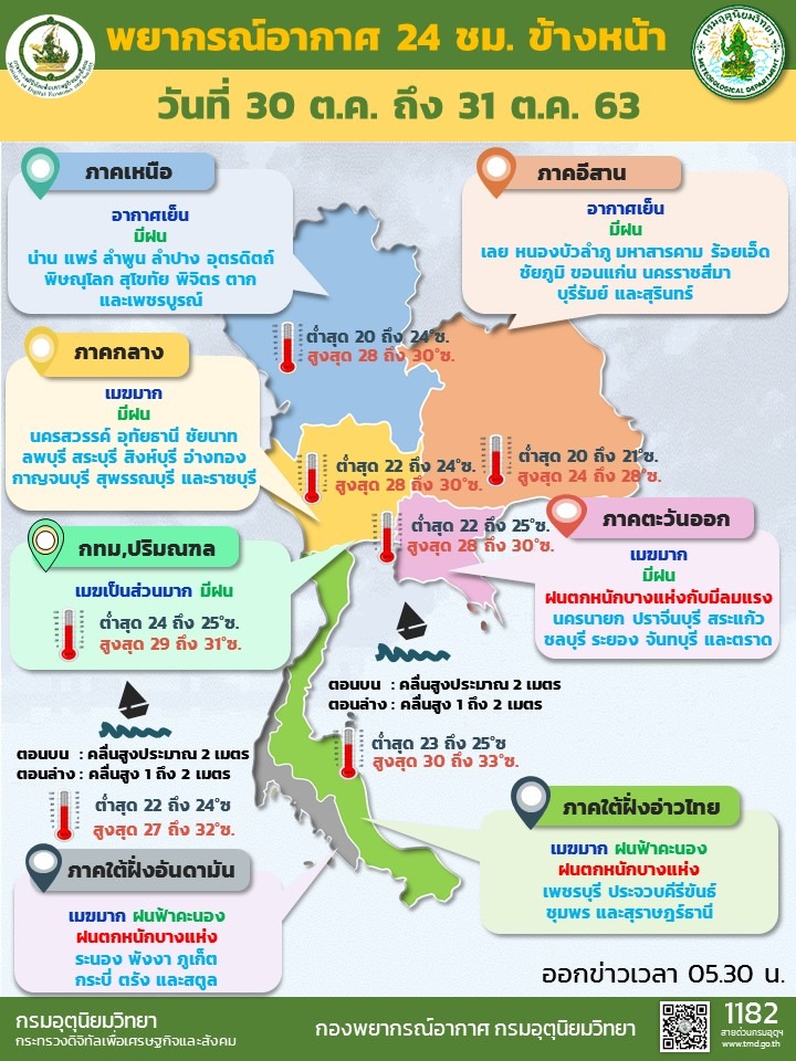 กรมอุตุนิยมวิทยา พยากรณ์อากาศ 24 ชั่วโมงข้างหน้า หย่อมความกดอากาศต่ำบริเวณภาคเหนือ และภาคตะวันออกเฉียงเหนือ ให้ประเทศไทยตอนบนมีฝนเล็กน้อยถึงปานกลางทั่วไป สำหรับลมตะวันตกเฉียงใต้ที่พัดปกคลุมทะเลอันดามัน ภาคใต้ และอ่าวไทยมีกำลังแรง ส่งผลทำให้ภาคใต้มีฝนตกหนักบางแห่งกับมีลมแรง ขอให้ประชาชนในพื้นที่เสี่ยงภัยในภาคตะวันออก และภาคใต้ ระวังอันตรายจากฝนตกหนักซึ่งอาจทำให้เกิดน้ำท่วมฉับพลันและน้ำป่าไหลหลากได้