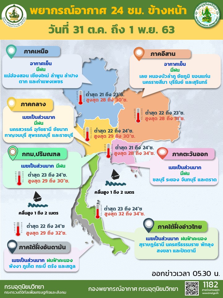 กรมอุตุนิยมวิทยา พยากรณ์อากาศ 24 ชั่วโมงข้างหน้า บริเวณความกดอากาศสูงหรือมวลอากาศเย็นจากประเทศจีนได้แผ่ลงมาปกคลุมภาคเหนือตอนบน และภาคตะวันออกเฉียงเหนือ ลักษณะเช่นนี้ทำให้บริเวณดังกล่าวมีอากาศเย็น โดยมีฝนเล็กน้อยบางแห่งในภาคเหนือ ภาคตะวันออกเฉียงเหนือ และภาคกลาง ขอให้ประชาชนบริเวณภาคเหนือ และภาคตะวันออกเฉียงเหนือดูแลสุขภาพเนื่องจากสภาพอากาศที่เปลี่ยนแปลงไว้ด้วย