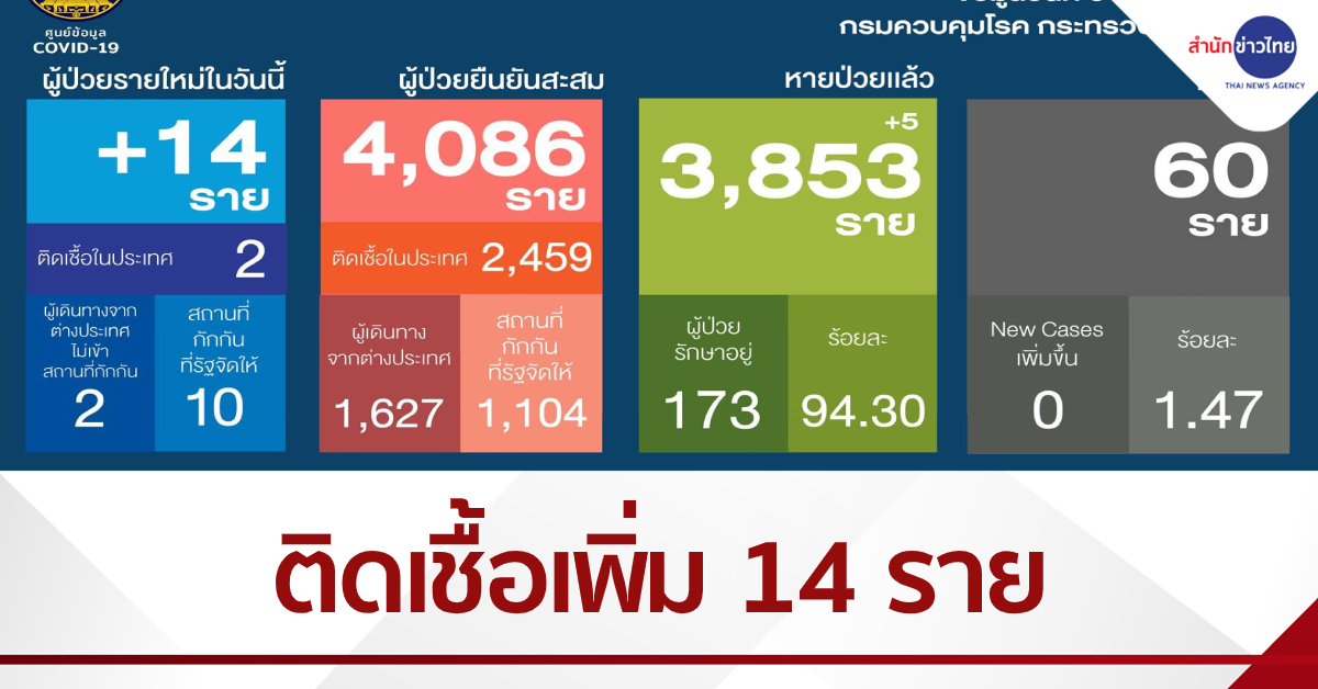 ศบค.แถลงพบผู้ติดเชื้อโควิด-19 รายใหม่ 14 ราย