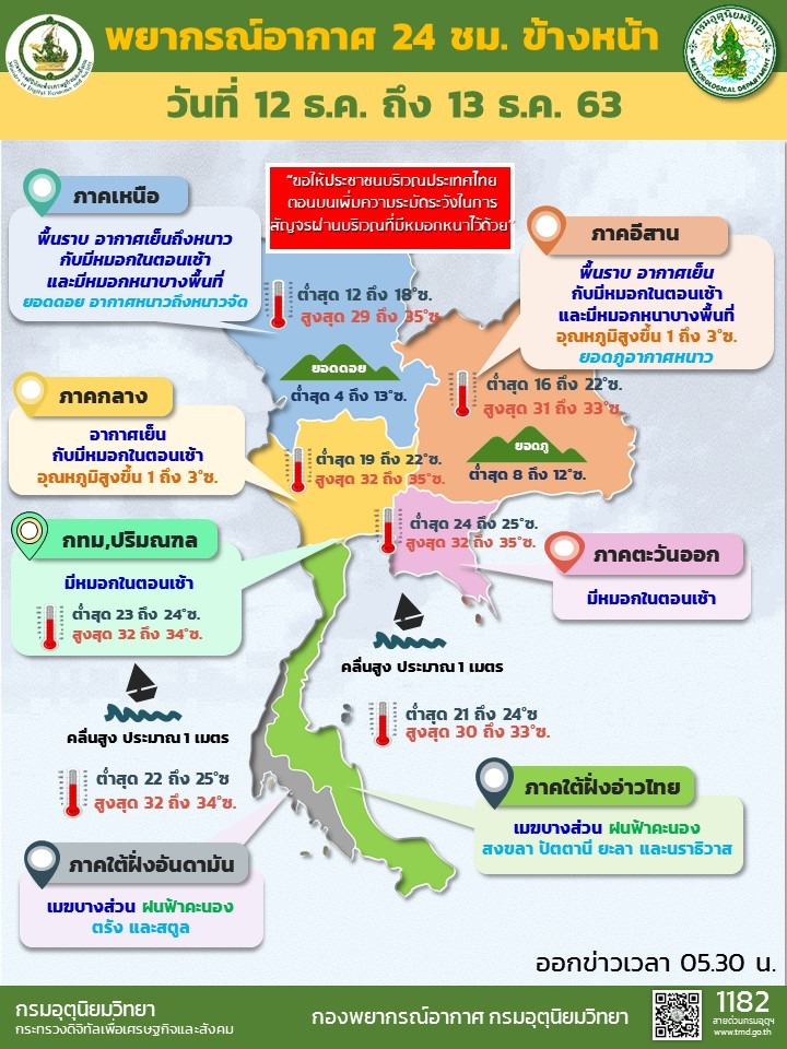 กรมอุตุนิยมวิทยา พยากรณ์อากาศ 24 ชั่วโมงข้างหน้า บริเวณความกดอากาศสูงหรือมวลอากาศเย็นที่ปกคลุมประเทศไทยตอนบนมีกำลังอ่อน ทำให้บริเวณประเทศไทยตอนบนมีอุณหภูมิสูงขึ้น 1-3 องศาเซลเซียส กับมีหมอกในตอนเช้าและมีหมอกหนาในบางพื้นที่ แต่ยังคงมีอากาศเย็นถึงหนาวในภาคเหนือ และภาคตะวันออกเฉียงเหนือ ส่วนยอดดอยมีอากาศหนาวถึงหนาวจัด ขอให้ประชาชนบริเวณประเทศไทยตอนบนเพิ่มความระมัดระวังในการสัญจรผ่านบริเวณที่มีหมอกหนาไว้ด้วย สำหรับมรสุมตะวันออกเฉียงเหนือที่พัดปกคลุมอ่าวไทยและภาคใต้มีกำลังอ่อน ทำให้ภาคใต้มีฝนน้อย