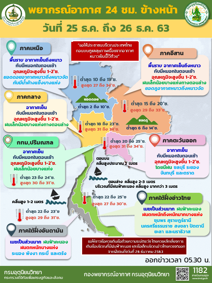 กทม. 25 ธ.ค.-กรมอุตุฯ ภาคใต้ ฝนตกหนักถึงหนักมากบางแห่ง ขอประชาชนบริเวณที่ลาดเชิงเขาและพื้นที่ลุ่มต่างๆ ระวังน้ำท่วมฉับพลันและน้ำป่าไหลหลาก ไทยตอนบนอุณหภูมิสูงขึ้น 1-2 องศาฯ มีหมอกในตอนเช้า กับมีฝนบางแห่ง