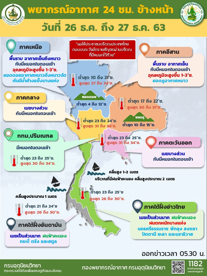 กรมอุตุนิยมวิทยา พยากรณ์อากาศ 24 ชั่วโมงข้างหน้า บริเวณความกดอากาศสูงหรือมวลอากาศเย็นที่ปกคลุมประเทศไทยตอนบนและทะเลจีนใต้มีกำลังอ่อน ทำให้บริเวณดังกล่าวมีอุณหภูมิสูงขึ้น 1-3 องศาเซลเซียส กับมีหมอกในตอนเช้า แต่ยังคงมีอากาศเย็นถึงหนาวในภาคเหนือและภาคตะวันออกเฉียงเหนือ ส่วนบริเวณยอดดอยและยอดภูมีอากาศหนาวถึงหนาวจัดและมีน้ำค้างแข็งบางพื้นที่ ขอให้ประชาชนบริเวณประเทศไทยตอนบนระวังอัตรายสัญจรผ่านบริเวณที่มีหมอกไว้ด้วย