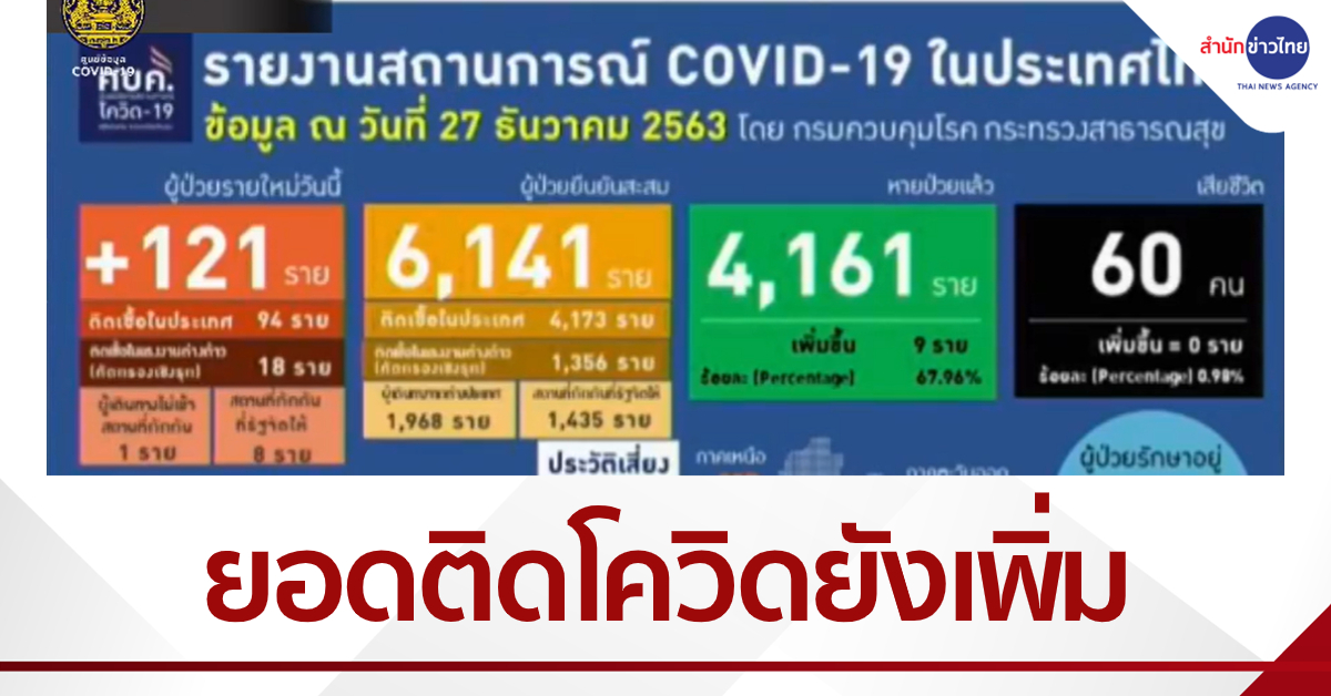 กรุงเทพฯ 27 ธ.ค.- ศูนย์บริหารสถานการณ์โควิด-19 รายงานสถานการณ์การติดเชื้อโควิด-19 ประจำวันอาทิตย์ที่ 27 ธันวาคม 2563 เวลา 11.30 น. พบผู้ป่วยรายใหม่ 121 ราย โดยส่วนใหญ่ยังเป็นการติดเชื้อในประเทศ 94 ราย ทำให้มีผู้ป่วยยืนยันสะสม 6,141 ราย หายป่วยแล้ว 4,161 ราย เสียชีวิตสะสม 60 ราย.- สำนักข่าวไทย