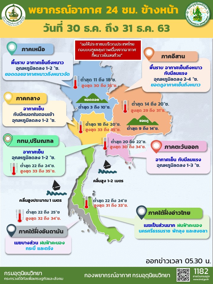 กรมอุตุนิยมวิทยา พยากรณ์อากาศ 24 ชั่วโมงข้างหน้า บริเวณความกดอากาศสูงหรือมวลอากาศเย็นกำลังแรงอีกระลอกจากประเทศจีนได้แผ่ลงมาปกคลุมประเทศเวียดนามและลาวตอนบนแล้ว และจะแผ่เข้าปกคลุมประเทศไทยตอนบนในวันนี้ ซึ่งจะทำให้ในช่วงวันที่ 30 ธ.ค.63 ถึง 3 ม.ค.64 บริเวณประเทศไทยตอนบนมีอากาศเย็นถึงหนาวกับมีลมแรง อุณหภูมิจะลดลง 6-8 องศาเซลเซียส สำหรับมรสุมตะวันออกเฉียงเหนือที่พัดปกคลุมอ่าวไทยและภาคใต้จะมีกำลังแรงขึ้น ทำให้ภาคใต้มีฝนเพิ่มขึ้น ส่วนคลื่นลมบริเวณอ่าวไทยจะมีกำลังแรง โดยอ่าวไทยตอนบนมีคลื่นสูง 2-3 เมตร ส่วนอ่าวไทยตอนล่างคลื่นสูง 2-4 เมตร บริเวณที่มีฝนฟ้าคะนองคลื่นสูงมากกว่า 3 เมตร
