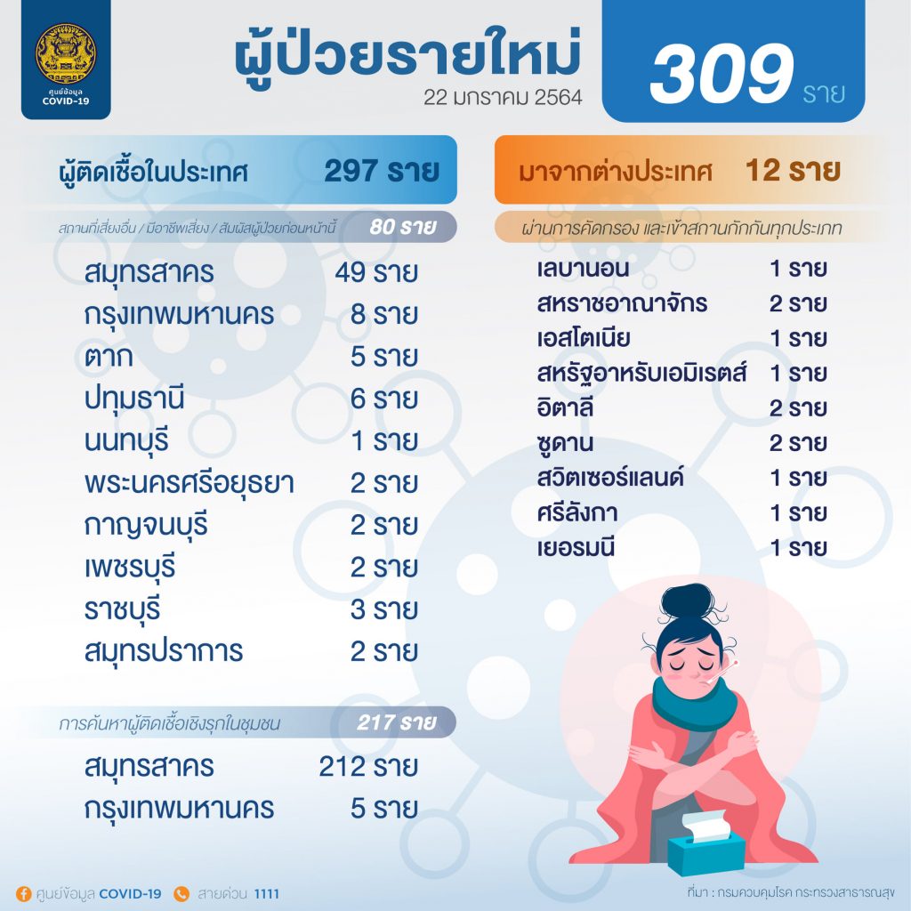 สำหรับผู้ป่วยรายใหม่ 309 ราย มาจากระบบเฝ้าระวังและระบบบริการฯ 80 ราย ค้นหาผู้ติดเชื้อเชิงรุกในชุมชน 217 ราย เป็นผู้เดินทางมาจากต่างประเทศ เข้าสถานที่กักกันที่รัฐจัดให้ 12 ราย . – สำนักข่าวไทย