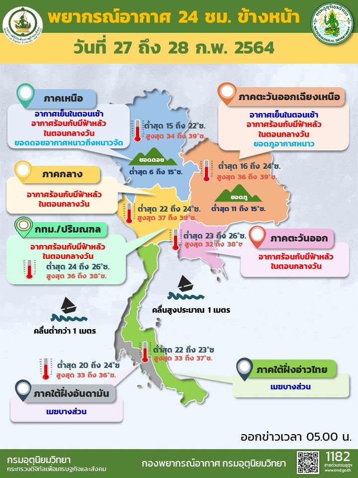 กรมอุตุนิยมวิทยา พยากรณ์อากาศ 24 ชั่วโมงข้างหน้า ความกดอากาศต่ำเนื่องจากความร้อนปกคลุมประเทศไทยตอนบน ลักษณะเช่นนี้ทำให้บริเวณดังกล่าวมีอากาศร้อนกับมีฟ้าหลัวในตอนกลางวัน ในขณะที่ลมตะวันตกในระดับบนพัดพาความหนาวเย็นจากเทือกเขาหิมาลัยผ่านประเทศเมียนมาเข้ามาปกคลุมภาคเหนือและภาคตะวันออกเฉียงเหนือตอนบน ทำให้ภาคเหนือตอนบนและภาคตะวันออกเฉียงเหนือตอนบนมีอากาศเย็นในตอนเช้า ส่วนลมตะวันออกกำลังอ่อนยังคงพัดปกคลุมภาคใต้และอ่าวไทยทำให้คลื่นลมบริเวณอ่าวไทยและอันดามันมีกำลังอ่อน