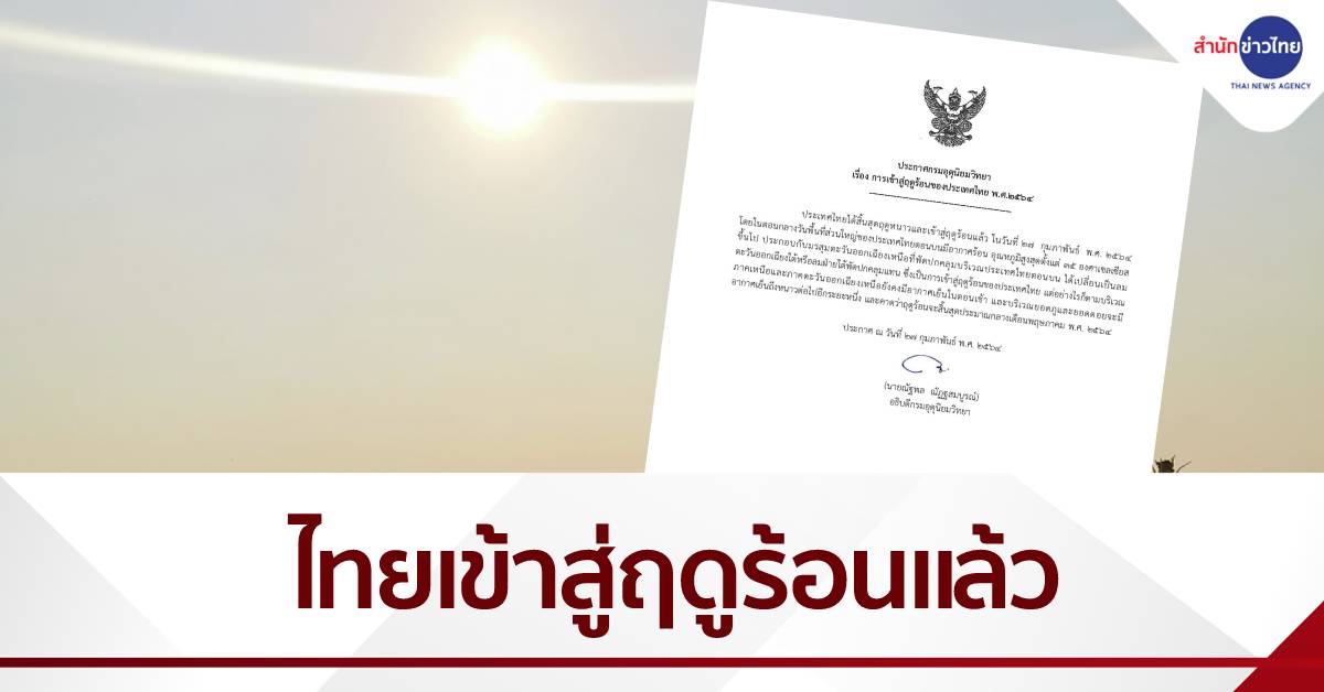 กรมอุตุฯ ประกาศ ประเทศไทยได้สิ้นสุดฤดูหนาวและเข้าสู่ฤดูร้อนแล้ว ในวันที่ 27 ก.พ.64 โดยในตอนกลางวันพื้นที่ส่วนใหญ่ของประเทศไทยตอนบน มีอากาศร้อน อุณหภูมิสูงสุดตั้งแต่ 35 องศาฯ ขึ้นไป ประกอบกับมรสุมตะวันออกเฉียงเหนือที่พัดปกคลุมประเทศไทยตอนบน ได้เปลี่ยนเป็นลมตะวันออกเฉียงใต้ หรือลมฝ่ายใต้พักปกคลุมแทน ซึ่งเป็นการเข้าสู่ฤดูร้อนของประเทศไทย แต่อย่างไรก็ตามบริเวณภาคเหนือและภาคตะวันออกเฉียงเหนือ ยังคงมีอากาศเย็นในตอนเช้า และบริเวณยอดภูและยอดดอยจะมีอากาศเย็นถึงหนาวต่อไปอีกระยะหนึ่ง และคาดว่าฤดูร้อนจะสิ้นสุดประมาณกลางเดือน พ.ค. 2564.-สำนักข่าวไทย
