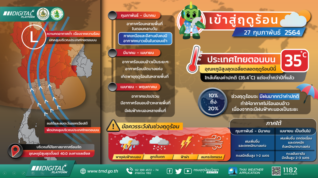 กทม. 27 ก.พ.-กรมอุตุฯ ประกาศ ประเทศไทยได้สิ้นสุดฤดูหนาวและเข้าสู่ฤดูร้อนแล้ว ในวันที่ 27 ก.พ.64 อุณหภูมิสูงสุดตั้งแต่ 35 องศาฯ ขึ้นไป