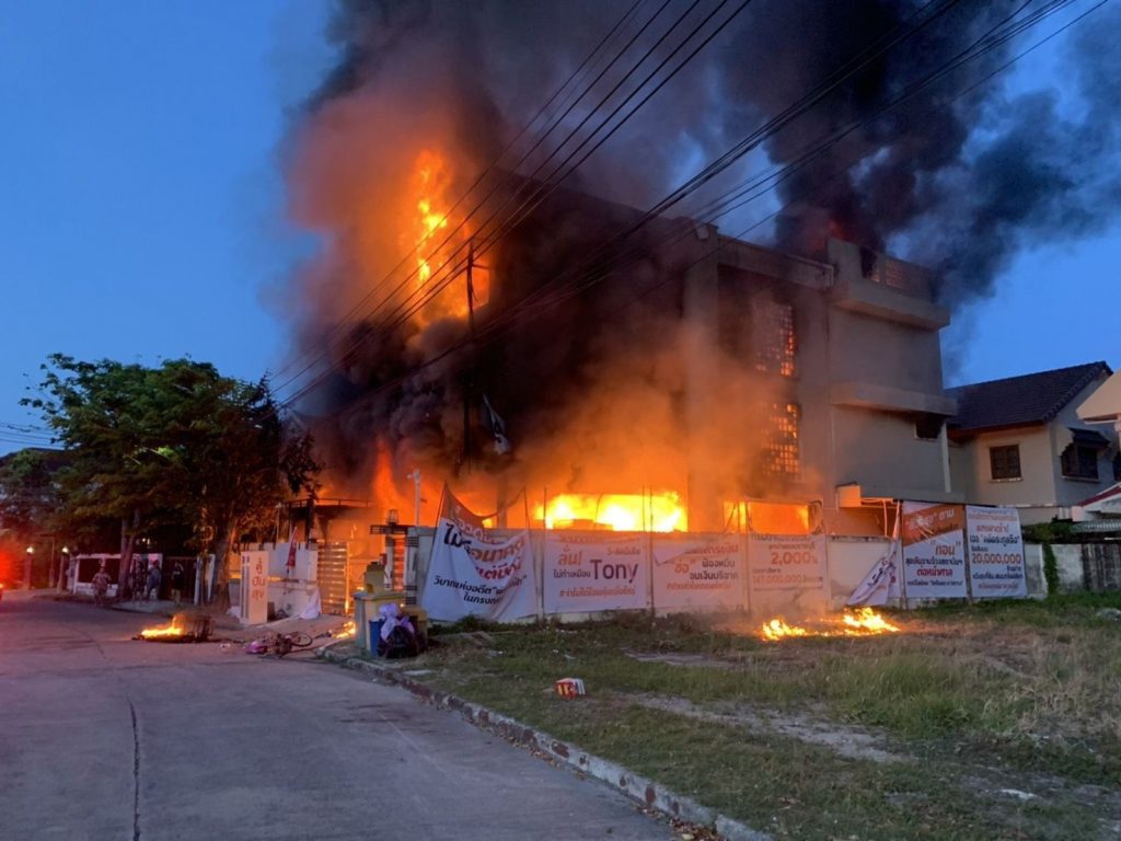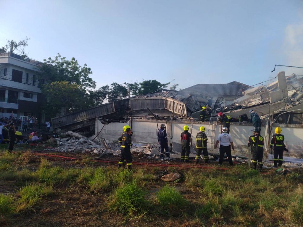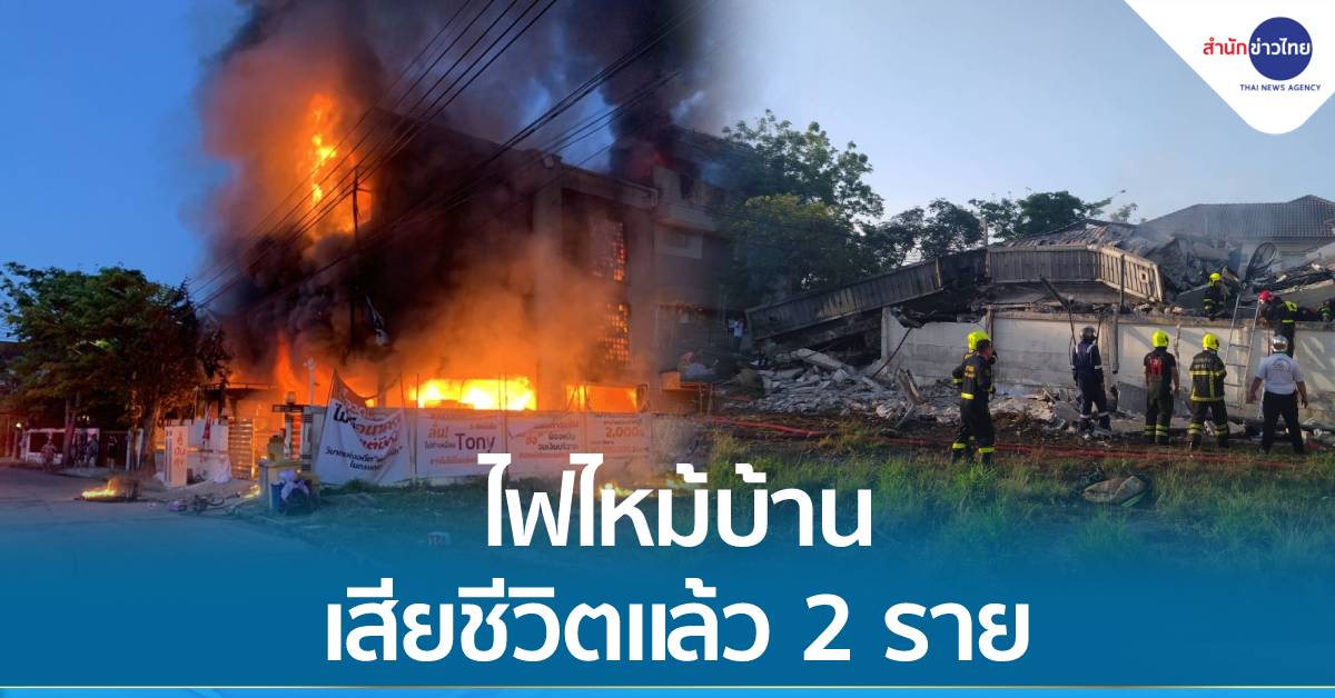 เวลา 06.52 น. เพลิงสงบ เจ้าหน้ากู้ภัยและดับเพลิงกำลังจะเข้าตรวจสอบบ้านที่เพลิงไหม้ เกิดพังถล่มลงมาทั้งหลัง เบื้องต้นเสียชีวิตไม่ต่ำกว่า 2 ราย บาดเจ็บอย่างน้อย 3 ราย.-สำนักข่าวไทย