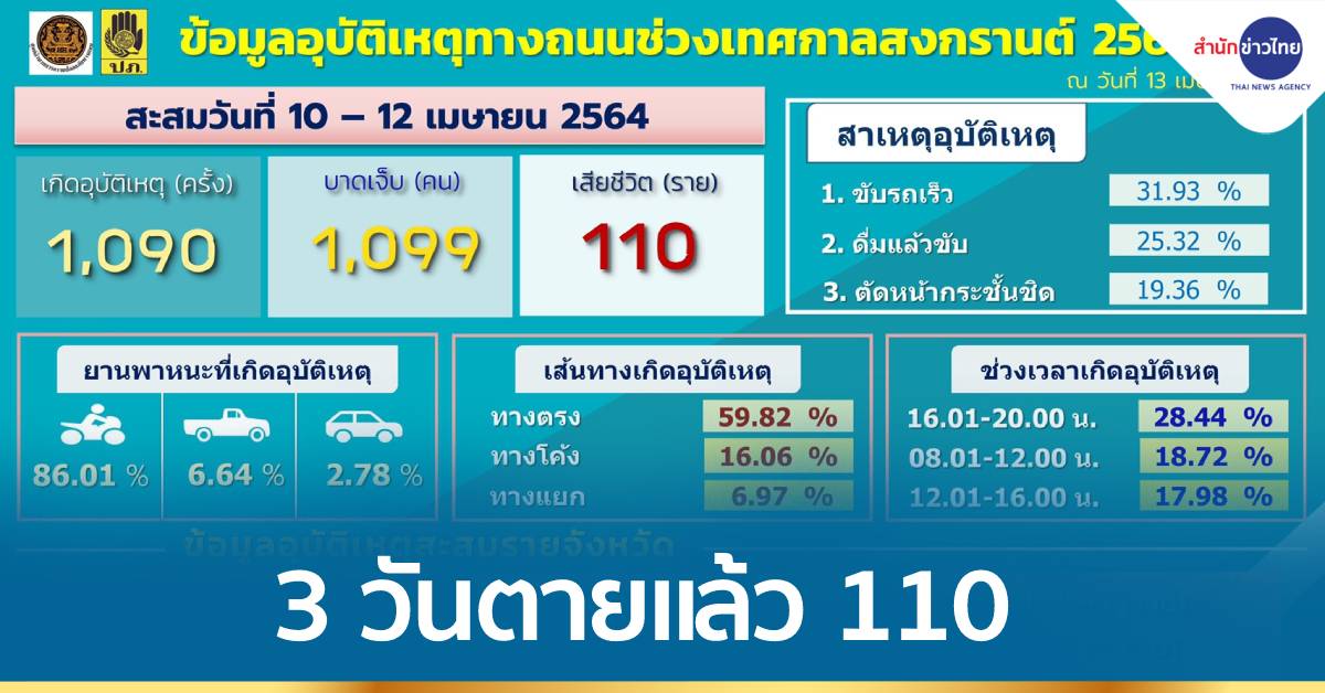 กทม. 13 เม.ย.-ศปถ. สรุป 3 วัน อุบัติเหตุรวม 1,090 ครั้ง เสียชีวิต 110 ราย บาดเจ็บ 1,099 คน ประสานจังหวัดใช้กลไกในระดับพื้นที่ ตั้งด่านชุมชน บังคับใช้กฎหมายจราจร-เครื่องดื่มแอลกอฮอล์อย่างเคร่งครัด