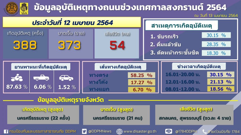 นายอรรษิษฐ์ สัมพันธรัตน์ รองปลัดกระทรวงมหาดไทย ในฐานะประธานคณะอนุกรรมการเฉพาะกิจศูนย์อำนวยการป้องกันและลดอุบัติเหตุทางถนนตลอดทั้งปี เปิดเผยว่า ศูนย์อำนวยการป้องกันและลดอุบัติเหตุทางถนนช่วงเทศกาลสงกรานต์ พ.ศ. 2564 โดยกรมป้องกันและบรรเทาสาธารณภัยและความร่วมมือของหน่วยงานภาคีเครือข่ายได้รวบรวมสถิติอุบัติเหตุทางถนนประจำวันที่ 12 เมษายน 2564 ซึ่งเป็นวันสามของการรณรงค์ “สงกรานต์สุขใจ ขับขี่ปลอดภัย ห่างไกลโควิด” เกิดอุบัติเหตุ 388 ครั้ง ผู้เสียชีวิต 54 ราย ผู้บาดเจ็บ 373 คน สาเหตุที่ทำให้เกิดอุบัติเหตุสูงสุด ได้แก่ ขับรถเร็ว ร้อยละ 30.15 ดื่มแล้วขับ ร้อยละ 28.35 ยานพาหนะที่เกิดอุบัติเหตุสูงสุด ได้แก่ รถจักรยานยนต์ ร้อยละ 87.63 ส่วนใหญ่เกิดบนเส้นทางตรง ร้อยละ 58.25 ถนนกรมทางหลวง ร้อยละ 36.08 ถนนใน อบต./หมู่บ้าน ร้อยละ 33.51 ช่วงเวลาที่เกิดอุบัติเหตุสูงสุด ได้แก่ ช่วงเวลา 16.01 – 20.00 น. ร้อยละ 30.15 ผู้บาดเจ็บและเสียชีวิตสูงสุดอยู่ในช่วงอายุ 50 ปีขึ้นไป ร้อยละ 29.74 ทั้งนี้ ได้จัดตั้งจุดตรวจหลัก 1,896 จุด เจ้าหน้าที่ปฏิบัติงาน 59,079 คน เรียกตรวจยานพาหนะ 343,703 คัน มีผู้ถูกดำเนินคดี รวม 65,929 ราย มีความผิดฐานไม่มีใบขับขี่ 18,210 ราย ไม่สวมหมวกนิรภัย 16,553 ราย โดยจังหวัดที่เกิดอุบัติเหตุสูงสุด ได้แก่ นครศรีธรรมราช (22 ครั้ง) จังหวัดที่มีผู้เสียชีวิตสูงสุด ได้แก่ สกลนคร สุพรรณบุรี (จังหวัดละ 4 ราย) จังหวัดที่มีผู้บาดเจ็บสูงสุด ได้แก่ นครศรีธรรมราช (21 คน) สรุปอุบัติเหตุทางถนนสะสมในช่วง 3 วันของการรณรงค์ (10 – 12 เม.ย. 64) เกิดอุบัติเหตุรวม 1,090 ครั้ง ผู้เสียชีวิตรวม 110 ราย ผู้บาดเจ็บ รวม 1,099 คน จังหวัดที่ไม่มีผู้เสียชีวิต (ตายเป็นศูนย์) มี 25 จังหวัด จังหวัดที่เกิดอุบัติเหตุสะสมสูงสุดได้แก่ นครศรีธรรมราช (49 ครั้ง) จังหวัดที่มีผู้เสียชีวิตสะสมสูงสุด ได้แก่ ชลบุรี (6 ราย) จังหวัดที่มีผู้บาดเจ็บสะสมสูงสุด ได้แก่ นครศรีธรรมราช (52 คน)