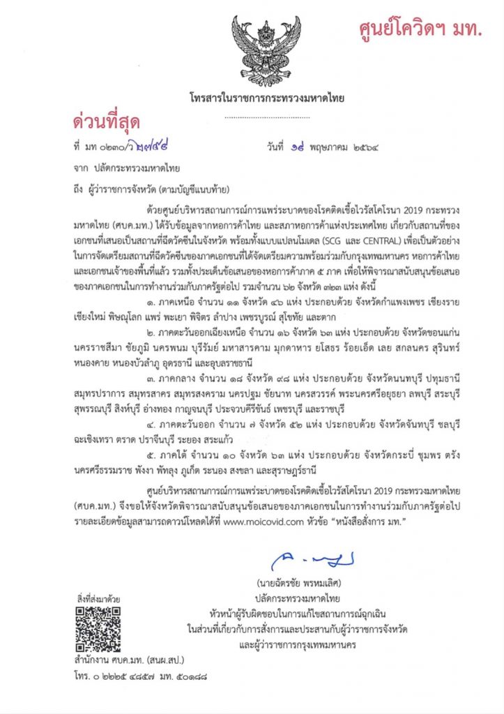 นายฉัตรชัย พรหมเลิศ ปลัดกระทรวงมหาดไทย ในฐานะหัวหน้าผู้รับผิดชอบในการแก้ไขสถานการณ์ฉุกเฉินในส่วนที่เกี่ยวกับการสั่งการและประสานกับผู้ว่าราชการจังหวัดและผู้ว่าราชการกรุงเทพมหานคร มีหนังสือด่วนถึงผู้ว่าราชการจังหวัด เนื่องด้วย ด้วยศูนย์บริหารสถานการณ์การแพร่ระบาดของโรคติดเชื้อไวรัสโคโรนา 2019 กระทรวงมหาดไทย (ศบค.มท.) ได้รับข้อมูลจากหอการค้าไทย และสภาหอการค้าแห่งประเทศไทย เกี่ยวกับสถานที่ของเอกชนที่เสนอเป็นสถานที่ฉีดวัคซีนในจังหวัด พร้อมทั้งแบบแปลนโมเดล (SCG และ CENTRAL) เพื่อเป็นตัวอย่างในการจัดเตรียมสถานที่ฉีดวัคซีนของภาคเอกชนที่ได้จัดเตรียมความพร้อมร่วมกับกรุงเทพมหานคร หอการค้าไทย และเอกชนเจ้าของพื้นที่แล้ว รวมทั้งประเด็นข้อเสนอของหอการค้าภาค 5 ภาค เพื่อให้พิจารณาสนับสนุนข้อเสนอของภาคเอกชนในการทำงานร่วมกับภาครัฐต่อไป รวมจำนวน 62 จังหวัด 323 แห่ง ดังนี้
