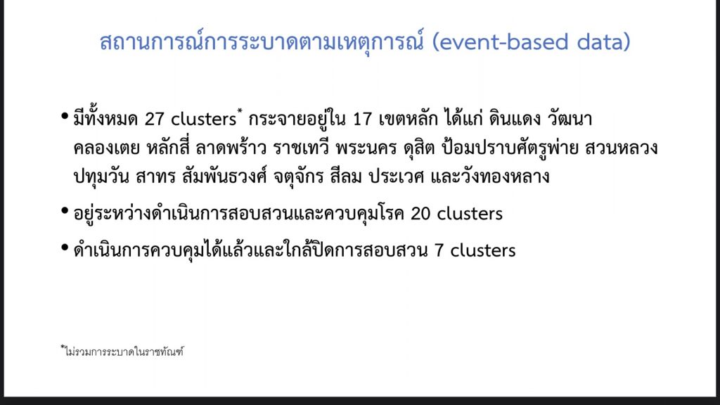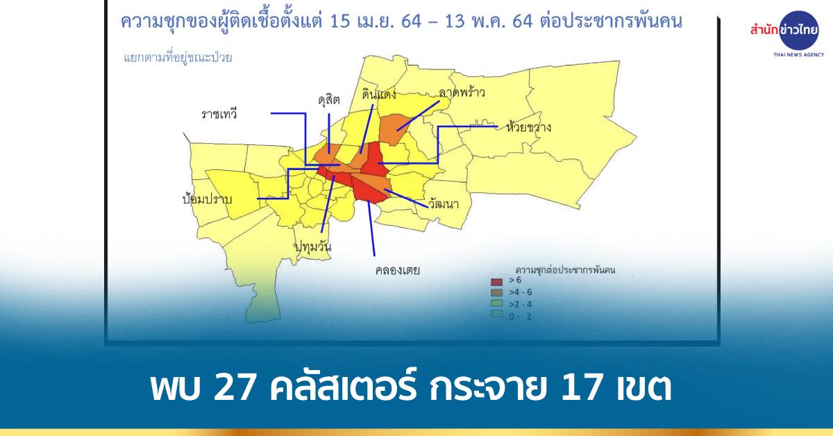 นพ.ทวีศิลป์ วิษณุโยธิน โฆษก ศบค. กล่าวว่าจากการวิเคราะห์การติดเชื้อตัวเลขใน กทม. ขณะนี้มีทั้งหมด 27 คลัสเตอร์สำคัญ กระจายใน 17 เขต ได้แก่ ดินแดง วัฒนา คลองเตย หลักสี่ ลาดพร้าว ราชเทวี พระนคร ดุสิต ป้อมปราบศัตรูพ่าย สวนหลวง ปทุมวัน สาธร สัมพันธวงศ์ จตุจักร สีลม ประเวศ และวังทองหลาง อยู่ระหว่างการดำเนินการสอบสวนและควบคุมโรค 27 คลัสเตอร์ สามารถดำเนินการควบคุมได้และใกล้ปิดการสอบสวน 7 คลัสเตอร์