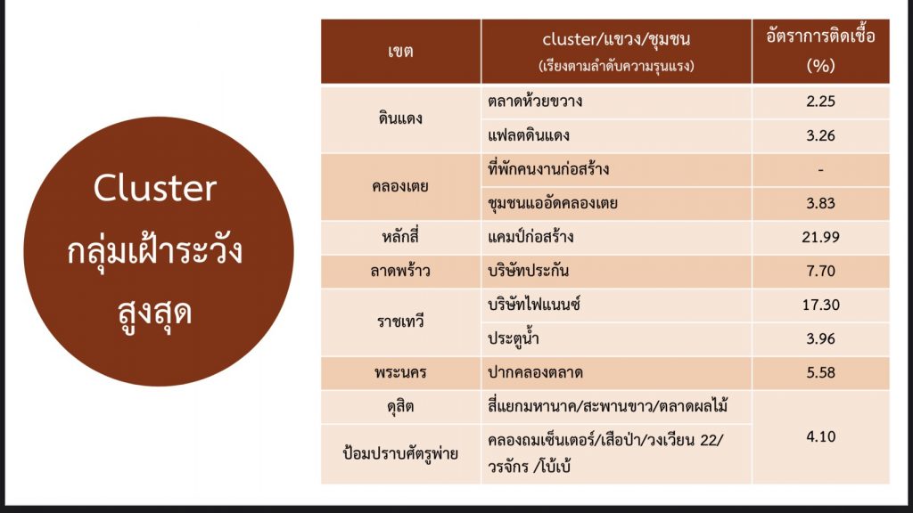 สำหรับข้อมูลพื้นที่ติดเชื้อในแคมป์คนงานก่อสร้าง โดยคลัสเตอร์ที่เป็นกลุ่มเฝ้าระวังสูงสุด 8 เขต ได้แก่ เขตดินแดง ตลาดห้วยขวาง อัตราการติดเชื้อ 2.25% แฟลตดินแดง ติดเชื้อ 3.26% , เขตคลองเตย ที่พักคนงานก่อสร้าง, ชุมชนแออัดคลองเตย ติดเชื้อ 3.83% ,หลักสี่ แคมป์ก่อสร้าง ติดเชื้อ 21.99% , เขตลาดพร้าว บริษัทประกัน รติดเชื้อ 7.70%, เขตราชเทวี บริษัทไฟแนนซ์ ติดเชื้อ 17.30% ประตูน้ำ ติดเชื้อ 3.96%, เขตพระนคร ปากคลองตลาด ติดเชื้อ 5.58%, เขตดุสิต สี่แยกมหานาค สะพานขาว สี่แยกผลไม้ ยังไม่มีรายงานติดเชื้อ และเขตป้อมปราบศัตรูพ่าย คลองถมเซ็นเตอร์ เสือป่า วงเวียน22 วรจักร โบ้เบ้ ติดเชื้อ 4.10% 17.30%