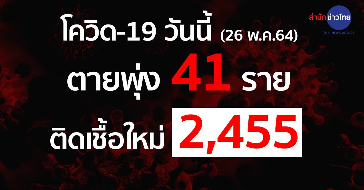 กทม. 26 พ.ค.-สถานการณ์โควิด-19 ในไทยวันนี้ เสียชีวิตพุ่ง 41 ราย ส่วนผู้ป่วยรายใหม่รวม 2,455 ราย แบ่งผู้ติดเชื้อใหม่ 1,976 ราย และในเรือนจำ 479 ราย
