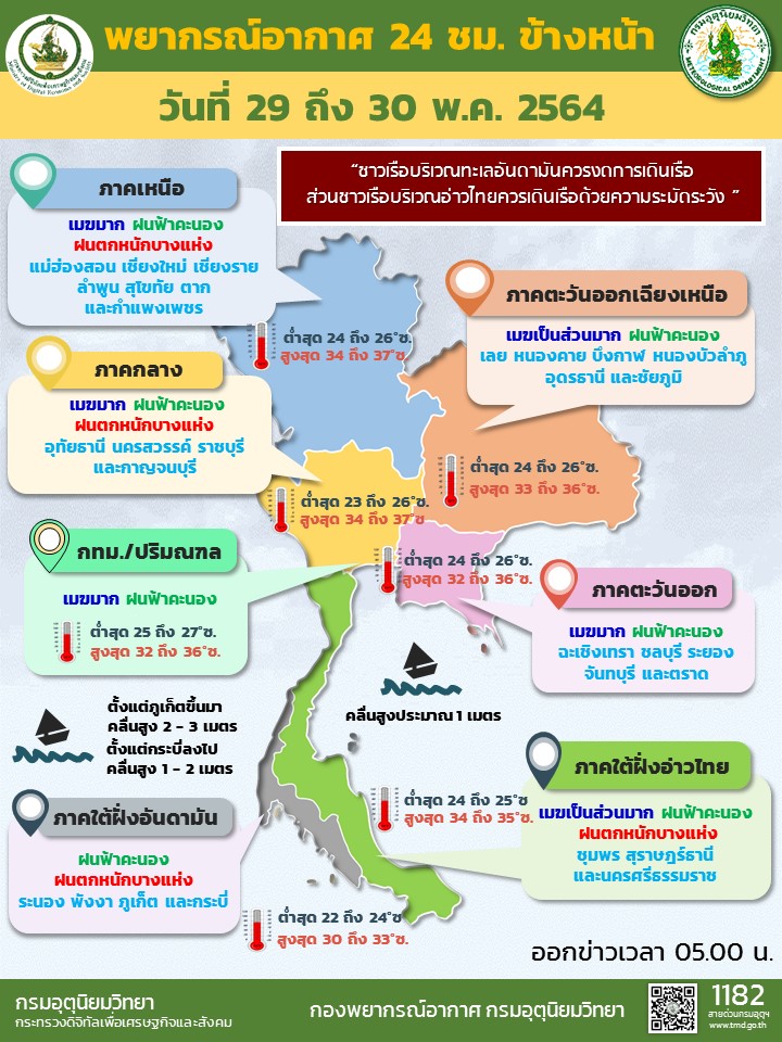 พยากรณ์อากาศสำหรับประเทศไทยตั้งแต่เวลา 06.00 น. วันนี้ ถึง 06.00 น. วันพรุ่งนี้