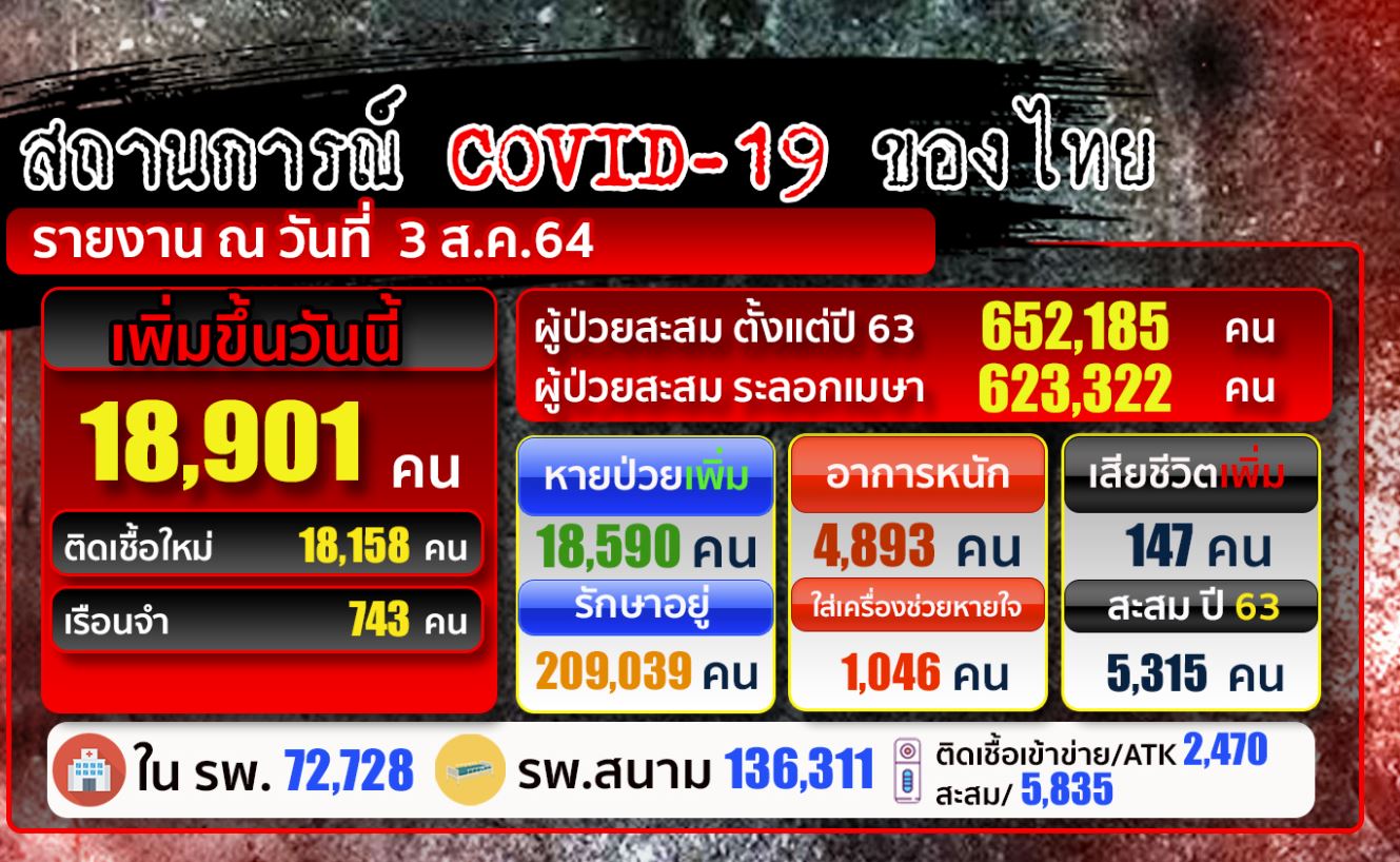 กทม. 3 ส.ค. – ศูนย์ข้อมูลโควิด-19 รายงานตัวเลขผู้ติดเชื้อประจำวันนี้ มีผู้ติดเชื้อเพิ่มหลักหมื่นเป็นวันที่ 17 แล้ว วันนี้ 18,901 คน เป็นผู้ติดเชื้อใหม่ที่รวมผู้เดินทางจากต่างประเทศ การตรวจเชิงรุก และการ walk-in รวม 18,158 คน และผู้ติดเชื้อในเรือนจำ 743 คน ส่วนตัวเลขของผู้ติดเชื้อจากผล ATK หรือ Antigen Test Kit 2,470 คน ทำให้ขณะนี้สะสมการตรวจจาก ATK 5,835 คน ส่วนยอดผู้ติดเชื้อรวมตั้งแต่ปี 2563 สะสม 652,185 คน