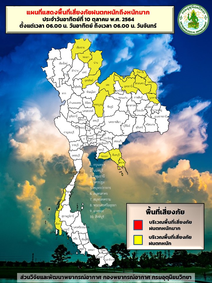 อนึ่ง พายุโซนร้อน “ไลออนร็อก” บริเวณอ่าวตังเกี๋ย คาดว่าจะเคลื่อนขึ้นฝั่งบริเวณประเทศเวียดนามตอนบนในช่วงวันที่ 10-11 ตุลาคม 2564 และจะอ่อนกำลังลงตามลำดับ ส่วนพายุโซนร้อน “คมปาซุ” บริเวณมหาสมุทรแปซิฟิกยังไม่มีผลกระทบต่อลักษณะอากาศของประเทศไทยในระยะนี้