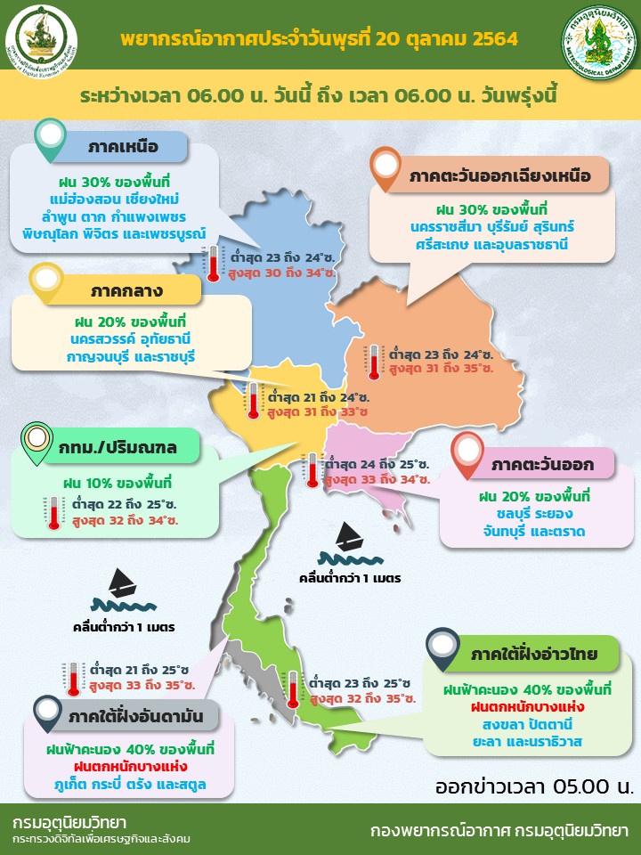 กทม. 20 ต.ค.-กรมอุตุฯ เผยไทยตอนบนมีฝนน้อย ส่วนภาคใต้ยังมีฝนฟ้าคะนองเกิดขึ้นกับมีฝนตกหนักบางแห่งในระยะนี้ ส่วนกรุงเทพฯ-ปริมณฑล มีฝน 10% ของพื้นที่