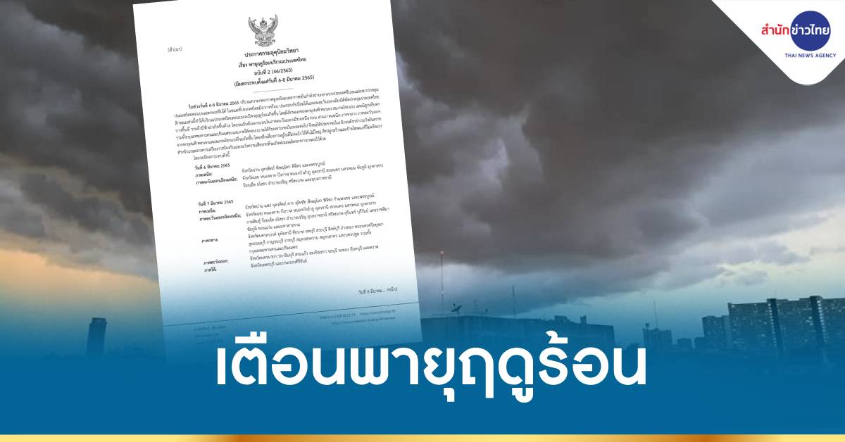 กรมอุตุนิยมวิทยา ประกาศฉบับที่ 2 “พายุฤดูร้อนบริเวณประเทศไทย” ในช่วงวันที่ 6-8 มีนาคม 2565 บริเวณความกดอากาศสูงหรือมวลอากาศเย็นกำลังปานกลางจากประเทศจีนจะแผ่ลงมาปกคลุมประเทศไทยตอนบนและทะเลจีนใต้ ในขณะที่ประเทศไทยมีอากาศร้อน ประกอบกับมีลมใต้และลมตะวันออกเฉียงใต้พัดปกคลุมประเทศไทย ลักษณะเช่นนี้ทำให้บริเวณประเทศไทยตอนบนจะมีพายุฤดูร้อนเกิดขึ้น โดยมีลักษณะของพายุฝนฟ้าคะนอง ลมกระโชกแรง และมีลูกเห็บตกบางพื้นที่ รวมถึงมีฟ้าผ่าเกิดขึ้นด้วย โดยจะเริ่มมีผลกระทบในภาคตะวันออกเฉียงเหนือก่อน ส่วนภาคเหนือ ภาคกลาง ภาคตะวันออก รวมทั้งกรุงเทพมหานครและปริมณฑล และภาคใต้ตอนบน จะได้รับผลกระทบในระยะต่อไป จึงขอให้ประชาชนในบริเวณดังกล่าวระวังอันตรายจากพายุฝนฟ้าคะนองและลมกระโชกแรงที่จะเกิดขึ้น โดยหลีกเลี่ยงการอยู่ในที่โล่งแจ้ง ใต้ต้นไม้ใหญ่ สิ่งปลูกสร้างและป้ายโฆษณาที่ไม่แข็งแรง สำหรับเกษตรกรควรเตรียมการป้องกันและระวังความเสียหายที่จะเกิดต่อผลผลิตทางการเกษตรไว้ด้วย