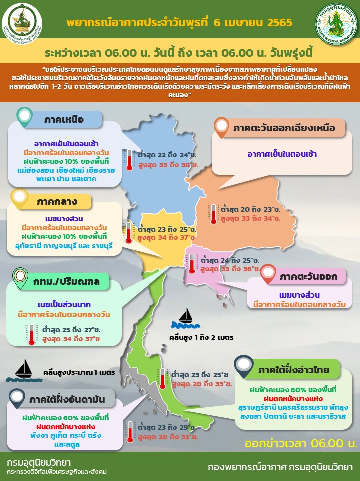 กรมอุตุฯ 6 เม.ย. – กรมอุตุฯ เผยภาคใต้ยังมีฝนตกหนักบางแห่ง ขอให้ระวังอันตรายจากน้ำท่วมฉับพลันและน้ำป่าไหลหลาก ต่อไปอีก 1-2 วัน ขณะที่ไทยตอนบนอุณหภูมิสูงขึ้น แต่ยังคงมีอากาศเย็นในตอนเช้า ส่วนกรุงเทพฯ-ปริมณฑล อากาศร้อนตอนกลางวัน