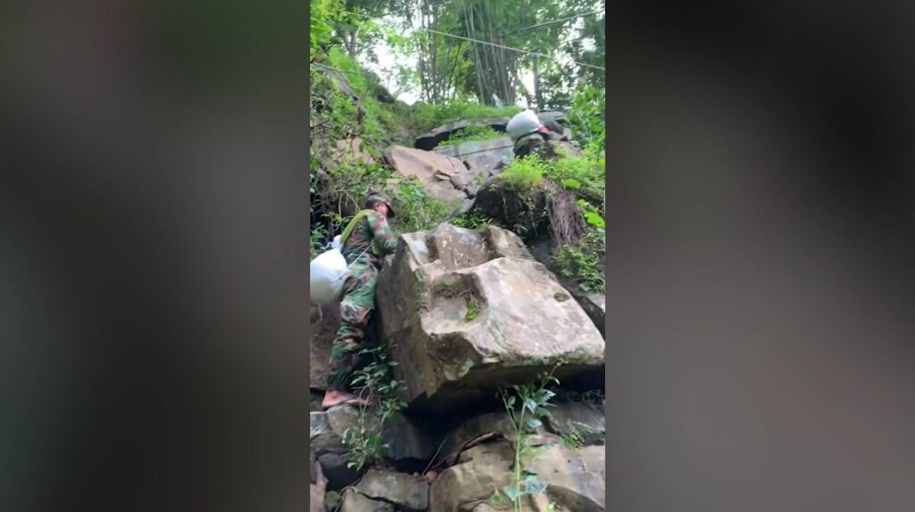 ส่วนภาพทหารกัมพูชา 8 นายกำลังพากันปีนเขาที่เต็มไปด้วยก้อนหินทั้งใหญ่และเล็ก โดยที่ด้านหลังบรรทุกสะเบียงและท่อPVC คาดว่าน่าจะแอบปีนขึ้นไปยังพื้นที่ของไทย.-สำนักข่าวไทย