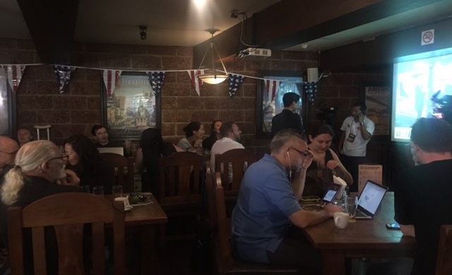ชาวอเมริกันในไทยที่สนับสนุนพรรคเดโมแครตกว่า 100 คน ทยอยเดินทางมารวมตัวกันที่ร้านอาหารย่านถนนสุรวงศ์ ตั้งแต่ก่อน 7.00 น. ขณะนี้ทุกคนต่างติดตามผลการเลือกตั้งสหรัฐ กันอย่างใจจดใจจ่อ โดยลุ้นให้นางฮิลลารี คลินตัน ผู้สมัครจากพรรคเดโมแครต เป็นประธานาธิบดีหญิงคนแรกของสหรัฐ