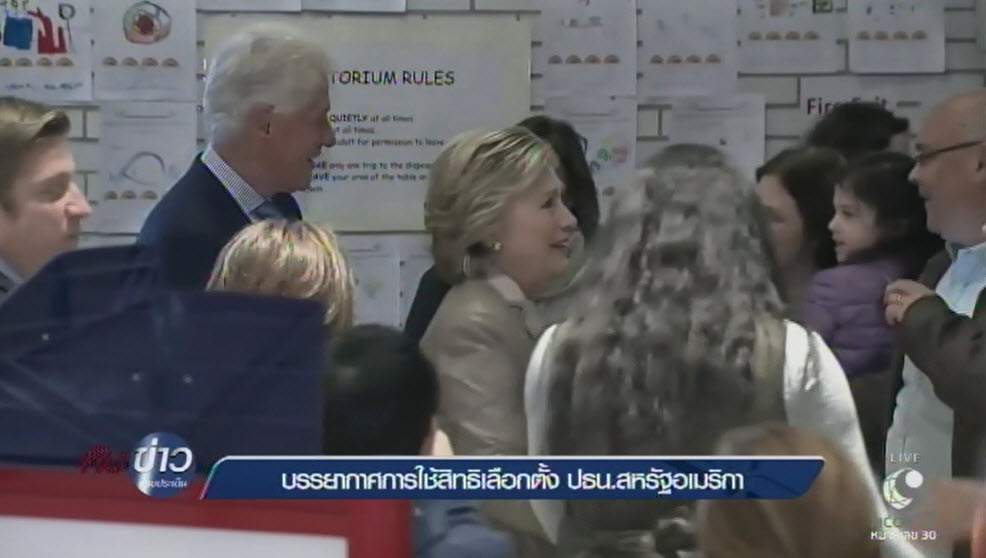 สำนักข่าวไทยรายงานสดจากนิวยอร์ก บรรยากาศชาวอเมริกันออกไปใช้สิทธิเลือกตั้งประธานาธิบดีสหรัฐ โดยนางฮิลลารี คลินตัน ตัวแทนพรรคเดโมแครต พร้อมด้วยนายบิล คลินตัน สามี เดินทางไปใช้สิทธิลงคะแนน ที่หน่วยเลือกตั้งในโรงเรียนแห่งหนึ่ง ในย่านชัพพากัว หมู่บ้านเล็กๆ ในนครนิวยอร์ก ท่ามกลางผู้สนับสนุนกว่า 150 คนรุมล้อมและเรียกเธอว่า มาดาม เพรสซิเดนท์ ขณะที่นางคลินตัน บอกว่า ดีใจที่ได้ออกมาใช้สิทธิ ขณะที่นายโดนัลด์ ทรัมป์ คู่แข่งจากพรรครีพับลิกัน ก็อยู่ที่นครนิวยอร์กแล้วเช่นกัน และจะเดินทางไปใช้สิทธิลงคะแนนที่หน่วยเลือกตั้ง ในย่านแมนฮัตตัน.-สำนักข่าวไทย