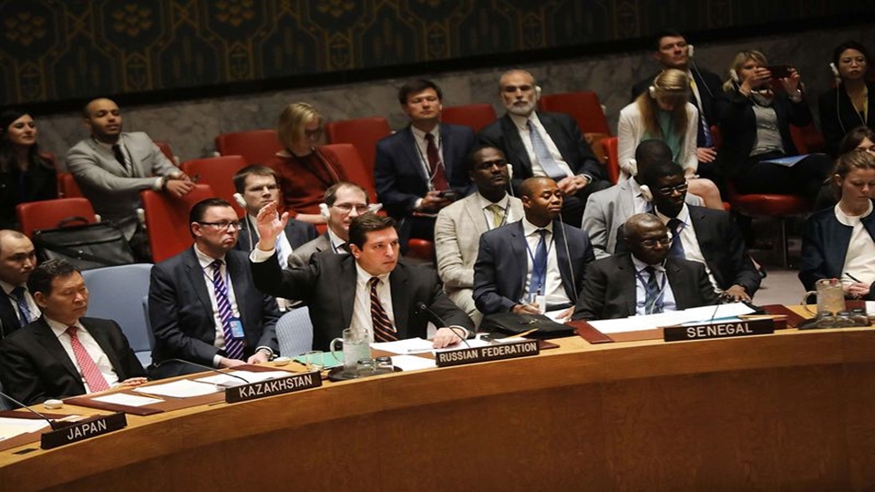 สหประชาชาติ 13 เม.ย.- รัสเซียใช้สิทธิยับยั้งหรือวีโตญัตติของคณะมนตรีความมั่นคงแห่งสหประชาชาติ (ยูเอ็นเอสซี) ที่จะดำเนินการกับซีเรียเป็นครั้งที่ 8 แล้วนับตั้งแต่สงครามกลางเมืองซีเรียปะทุขึ้นเมื่อ 6 ปีก่อน