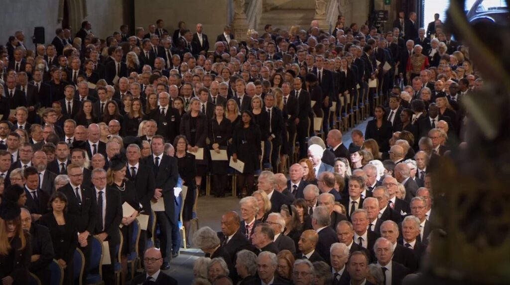 ช่วงเช้าวันนี้ตามเวลาท้องถิ่น พระเจ้าชาร์ลสที่ 3 พร้อมด้วยพระราชินีคามิลลา เสด็จพระราชดำเนินไปยังเวสต์มินสเตอร์ฮอลล์ เพื่อให้บรรดาสมาชิกรัฐสภาถวายความอาลัยต่อสมเด็จพระราชินีนาถเอลิซาเบธที่ 2 อย่างเป็นทางการ โดยเริ่มจากลอร์ด แม็คฟอลล์ ประธานสภาขุนนางกล่าวถวายอาลัย และเซอร์ ลินด์เซย์ โฮล์ ประธานสภาผู้แทนราษฎรกล่าวถวายอาลัยเป็นลำดับต่อไป นอกจากนี้สมาชิกรัฐสภายังกล่าวถวายสัตย์ปฏิญาณต่อพระมหากษัตริย์พระองค์ใหม่ด้วย และหลังจากนั้นพระเจ้าชาร์ลสที่ 3 ทรงมีพระราชดำรัสตอบต่อสมาชิกรัฐสภา