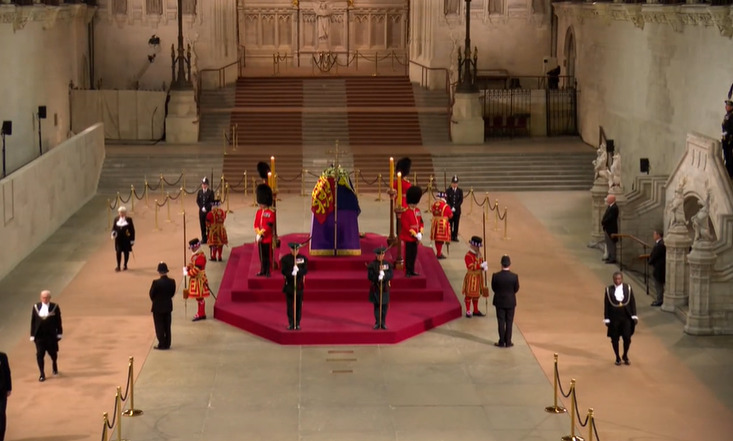 พสกนิกรจากทั่วอังกฤษและหลายประเทศเดินทางมาถวายสักการะพระบรมศพสมเด็จพระราชินีนาถเอลิซาเบธที่ 2 ขณะที่พระราชโอรส 3 พระองค์ และพระราชธิดา 1 พระองค์ร่วมพิธีอารักขาพระบรมศพเมื่อเย็นวันศุกร์ พระราชนัดดา 8 พระองค์ร่วมพิธีอารักขาพระบรมศพในเย็นวันเสาร์ ราชองค์รักษ์พิทักษ์หีบพระบรมศพเปลี่ยนเวรยามทุก 6 ชั่วโมง จนกระทั่งปิดการให้สาธารณชนเข้าถวายความอาลัยเมื่อเวลา 06:30 น.วันนี้ตามเวลาอังกฤษ ตรงกับเวลา 12:30 น.วันนี้ตามเวลาไทย