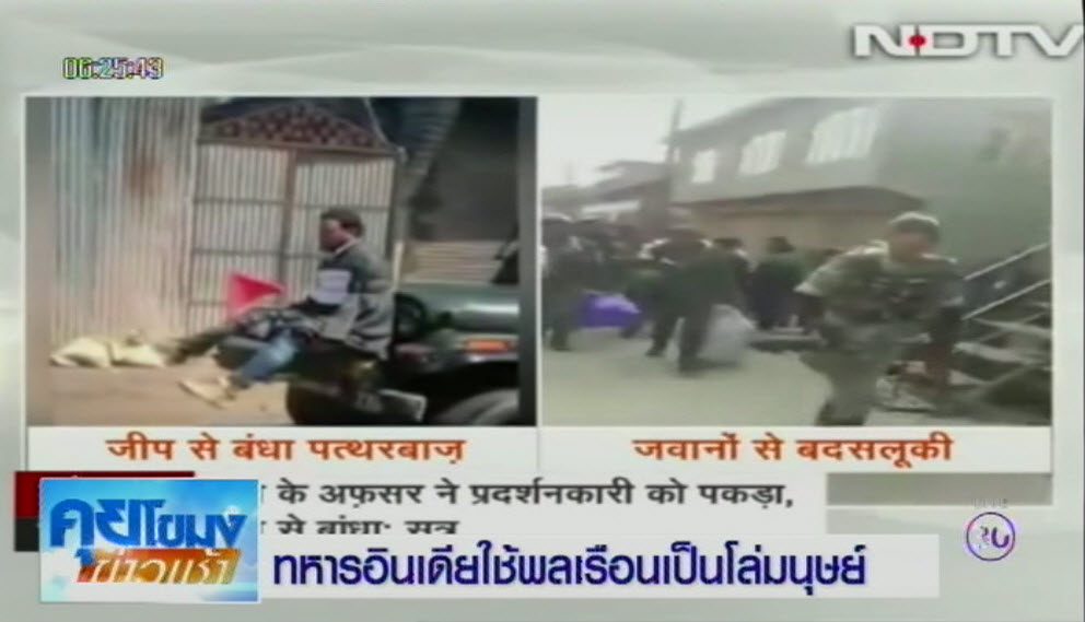 อินเดีย 19 เม.ย. – กองทัพอินเดียตกเป็นเป้าวิจารณ์อย่างหนัก หลังใช้พลเรือนมามัดติดด้านหน้ารถทหาร เป็นโล่มนุษย์ของจริง ป้องกันผู้ประท้วงปาหินใส่ในแคว้นแคชเมียร์