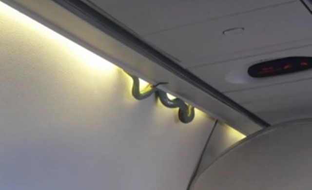 เม็กซิโกซิตี 8 พ.ย. – กลุ่มผู้โดยสารชั้นหนึ่งของสายการบินแอโรเม็กซิโกต้องเจอกับเหตุระทึกขวัญ เมื่อพบงูเลื้อยพาดอยู่ตรงผนังเครื่องบินบริเวณช่องเก็บของเหนือศีรษะในลักษณะห้อยหัวลงมา คล้ายกับฉากในหนังเรื่อง “Snakes in a Plane.”