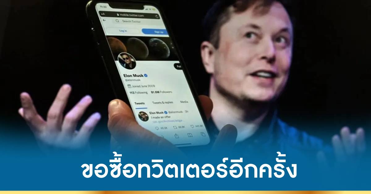 วอชิงตัน 5 ต.ค. – อีลอน มัสก์ มหาเศรษฐีชาวอเมริกันและประธานเจ้าหน้าที่บริหาร หรือซีอีโอ ของเทสลา ยื่นขอเสนอซื้อกิจการทวิตเตอร์อีกครั้งในราคา 44,000 ล้านดอลลาร์สหรัฐ (ราว 1.65 ล้านล้านบาท) ซึ่งเป็นราคาเดิมที่เขาเคยปิดดีลกับทวิตเตอร์ก่อนตัดสินใจยกเลิก และทำให้ทวิตเตอร์ต้องยื่นฟ้องต่อศาล