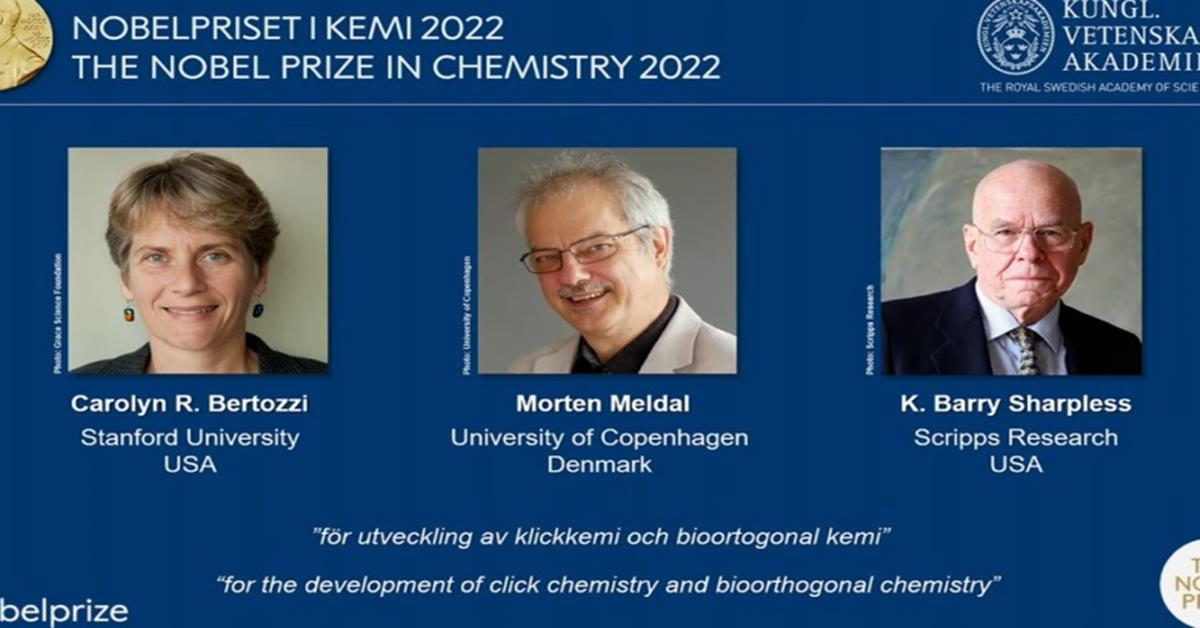 ราชบัณฑิตยสภาวิทยาศาสตร์สวีเดนประกาศให้ ดร.คาร์ล แบร์รี ชาร์ปเลสส์ นักเคมีชาวอเมริกันวัย 81 ปี ที่เคยคว้ารางวัลโนเบลสาขาเคมีมาแล้วในปี 2544 และ ดร.มอร์เทน พี.เมลดัล นักเคมีชาวเดนมาร์กวัย 67-68 ปี ได้รับรางวัลโนเบลสาขาประจำปี 2565 เนื่องจากนำพาเคมีเข้าสู่ยุคแห่งทฤษฎีหน้าที่นิยมและวางรากฐานให้แก่คลิกเคมี โดยได้รับรางวัลร่วมกับ ดร.แคโรลีน รูธ เบอร์โทซซี นักเคมีหญิงชาวอเมริกันวัย 55 ปี ผู้นำคลิกเคมีไปสู่มิติใหม่และเริ่มนำมาใช้ในการทำแผนที่เซลล์ ผลงานของเธอนำมาซึ่งการพัฒนาวิธีการที่เป็นประโยชน์มากมาย หนึ่งในนั้นคือ การรักษามะเร็งแบบจำเพาะเจาะจงต่อเซลล์.-สำนักข่าวไทย
