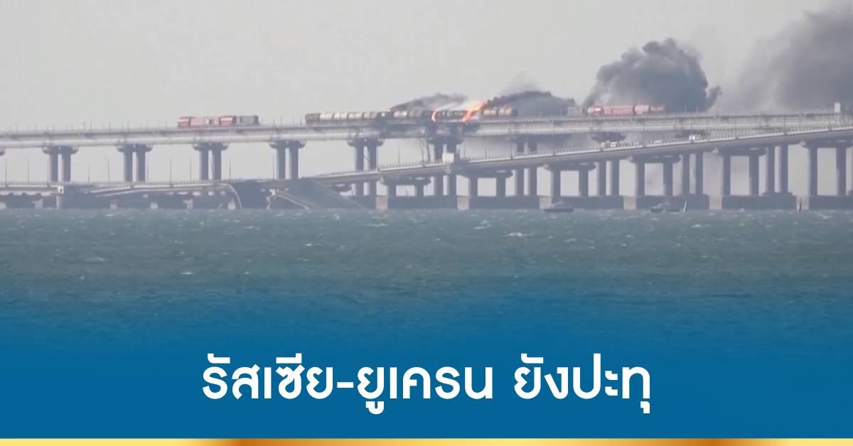 และในช่วงเวลาไล่เลี่ยกันก็เกิดเหตุรถบรรทุกน้ำมันระเบิดบนสะพานที่เชื่อมต่อระหว่างคาบสมุทรไครเมียซึ่งถูกรัสเซียผนวกดินแดนไปเมื่อปี 57 เหตุระเบิดเกิดขึ้นเมื่อเวลาประมาณ 06.00 น. วันนี้ ตรงกับ 10.00 น. ตามเวลาในบ้านเรา เป็นเหตุให้รถบรรทุกน้ำมัน 7 คันได้รับความเสียหาย รวมถึงรถไฟอีกขบวนหนึ่งที่กำลังเดินทางมุ่งหน้าไปยังคาบสมุทรไครเมีย แรงระเบิดและเพลิงที่ลุกไหม้ทำให้ตัวสะพานพังถล่มเป็นบางส่วน และต้องปิดการจราจรเป็นการชั่วคราวเพื่อประเมินความเสียหาย สะพานแห่งนี้เป็นทั้งทางรถยนต์และทางรถไฟเชื่อมต่อระหว่างแหลมไครเมียกับดินแดนของรัสเซีย เป็นเส้นทางสำคัญในการส่งกำลังบำรุงให้แก่กองกำลังของรัสเซียที่เข้าไปยึดครองภูมิภาคเคอร์ซอนทางตอนใต้ของยูเครน