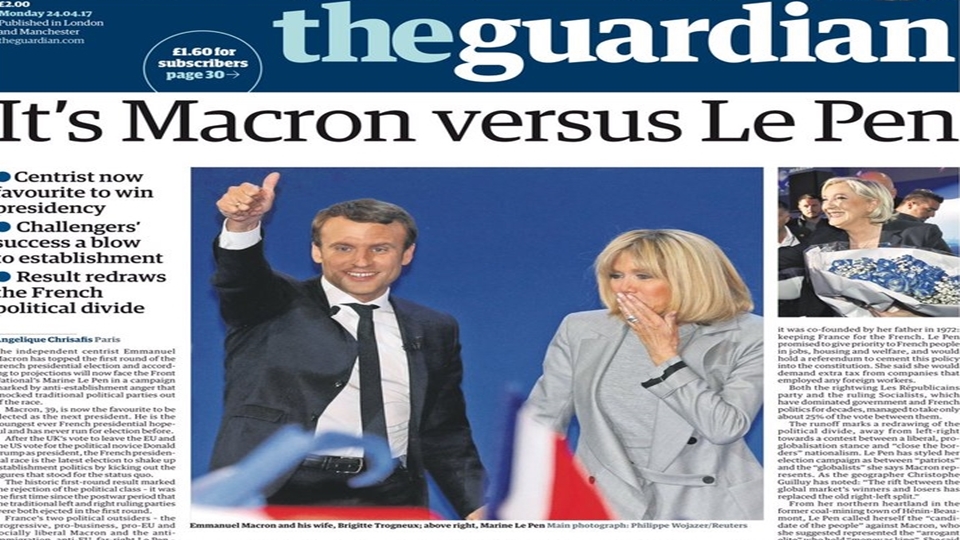 ปารีส 24 เม.ย.- สื่อกระแสหลักทั่วโลกพากันเกาะติดรายงานผลการเลือกตั้งประธานาธิบดีฝรั่งเศสรอบแรกและแสดงท่าทีสนับสนุนนายเอ็มมานูเอล มาครง ผู้สมัครสายกลางมากกว่านางมารีน เลอ เปน ผู้สมัครขวาจัด หลังจากทั้งคู่มีคะแนนมากที่สุดได้เข้าไปชิงชัยรอบสองในวันที่ 7 พฤษภาคม