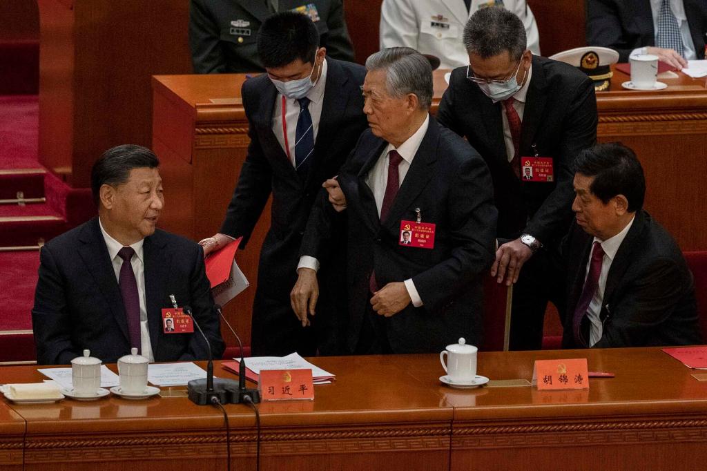 คลิปที่สำนักข่าวเอเอฟพีเผยแพร่เมื่อวันเสาร์เห็นเจ้าหน้าที่คนหนึ่งพยายามดึงตัวนายหูขึ้นจากที่นั่ง โดยมีผู้ที่นั่งอยู่ข้าง ๆ มองด้วยความเป็นห่วง จากนั้นนายหูได้วางมือบนกระดาษที่วางอยู่บนแฟ้มของประธานาธิบดีสี จิ้นผิง ซึ่งนั่งอยู่ด้านขวามือของเขา ประธานาธิบดีสีรีบวางมือบนกระดาษดังกล่าวทันที ขณะที่นายลี่ จ้านซู ประธานคณะกรรมการถาวรในสภาประชาชนแห่งชาติจีนที่นั่งอยู่ฝั่งซ้ายของนายหูได้ส่งแฟ้มของนายหูให้แก่เจ้าหน้าที่ และใช้ผ้าเช็ดศีรษะของตนเองหลังจากนายหูลุกขึ้น นายหูซึ่งดูไม่พอใจและพยายามขัดขืนเจ้าหน้าที่ได้พูดกับประธานาธิบดีสีและแตะไหล่นายกรัฐมนตรีหลี่ เค่อเฉียงที่นั่งอยู่ฝั่งขวาของประธานาธิบดีก่อนถูกนำตัวออกไปจากที่ประชุม