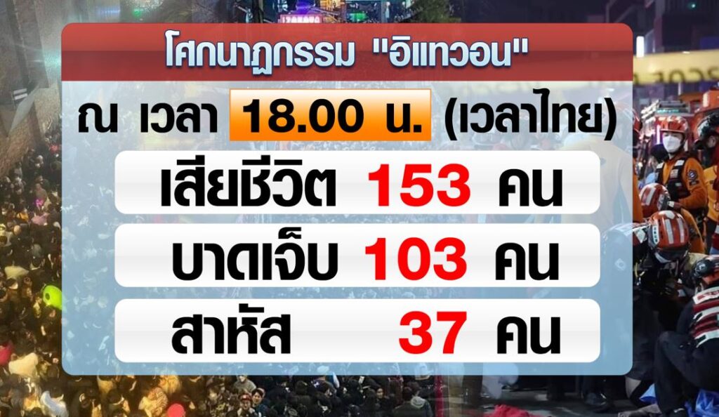 เกาหลีใต้ 30 ต.ค. – เหตุเหยียบกันตายในงานฉลองฮาโลวีนย่านอิแทวอนของเกาหลีใต้ เพิ่มเป็นอย่างน้อย 153 คน บาดเจ็บมากกว่า 80 คน ผู้นำเกาหลีใต้ประกาศไว้อาลัยทั่วประเทศ