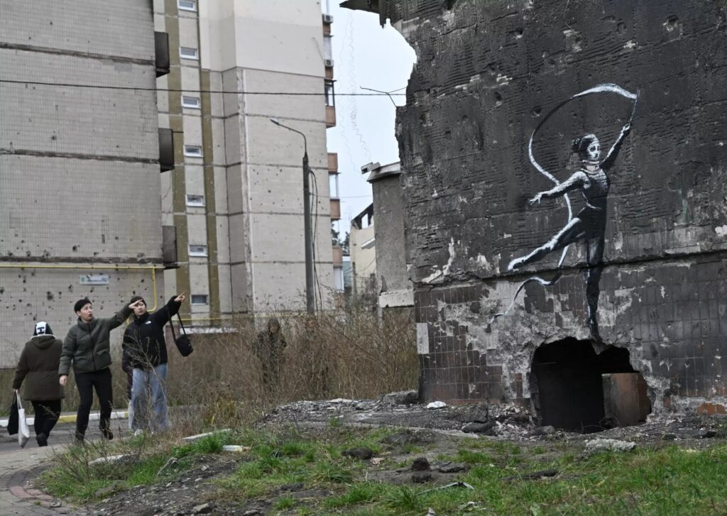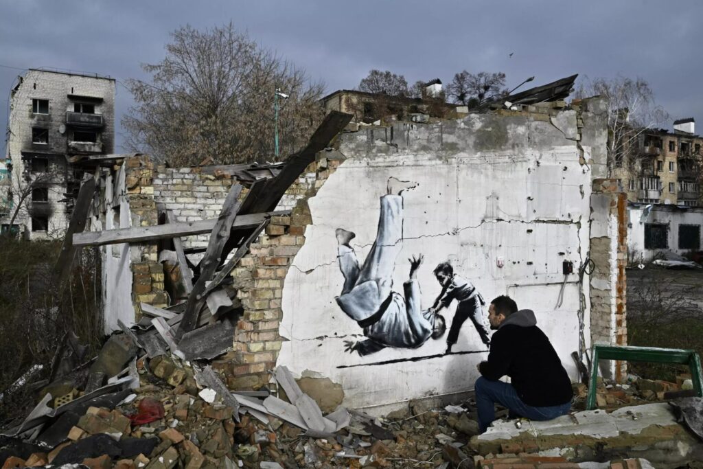 บอรอเดียนกา 13 พ.ย. – แบงก์ซี (Banksy) ศิลปินลึกลับแนวกราฟฟิตีสตรีตอาร์ตชาวอังกฤษที่มีชื่อเสียงโด่งดังไปทั่วโลก แสดงผลงานอีกครั้งเป็นภาพที่ปรากฏบนอาคารนอกกรุงเคียฟของยูเครน ที่ได้รับความเสียหายจากการโจมตีด้วยการทิ้งระเบิดของรัสเซีย